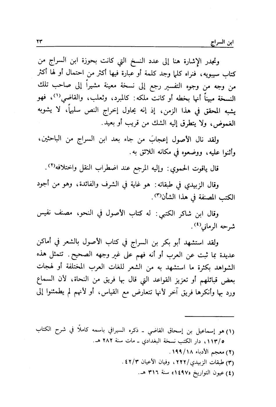 وتجدر الإشارة هنا إلى عدد النسخ التي كانت بحوزة ابن السراج من كتاب سيبويه، فنراه كلم وجد كلمة أو عبارة فيها أكثر من احتمال أو لها أكثر من وجه من وجوه التفسير رجع إلى نسخة معينة مشيرا إلى صاحب تلك النسخة مبينا أنها بخطه أو كانت ملكه: كالمبرد، وثعلب، والقاضي1، فهو يشبه المحقق في هذا الزمن، إذ إنه يحاول إخراج النص سليما، لا يشوبه الغموض، ولا يتطرق إليه الشك من قريب أو بعيد.