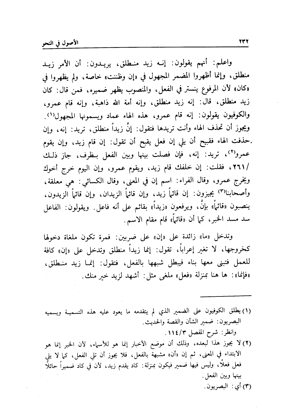 واعلم: أنهم يقولون: إنه زيد منطلق, يريدون: أن الأمر زيد منطلق, وإنما أظهروا المضمر المجهول في "إن وظننت" خاصة, ولم يظهروا في "كان" لأن المرفوع ينستر في الفعل والمنصوب يظهر ضميره فمن قال: كان زيد منطلق قال: إنه زيد منطلق وإنه أمة الله ذاهبة وإنه قام عمرو والكوفيون يقولون: إنه قام عمرو هذه الهاء عماد ويسمونها المجهول1. ويجوز أن تحذف الهاء وأنت تريدها فتقول: إنَّ زيدًا منطلق تريد: إنه وإن حذفت الهاء فقبيح أن يلي إن فعل يقبح أن تقول: إن قام زيد وإن يقوم عمرو2 تريد: إنه فإن فصلت بينها وبين الفعل بظرف جاز ذلك/ 261 فقلت: إن خلفك قام زيد ويقوم عمرو وإن اليوم خرج أخوك ويخرج عمرو وقال الفراء: اسم إن في المعنى وقال الكسائي: هي معلقة وأصحابنا3 يجيزون: إن قائمًا زيد وإن قائمًا الزيدان وإن قائمًا الزيدون ينصبون "قائمًا" بإنَّ ويرفعون "زيدًا" بقائم على أنه فاعل. ويقولون: الفاعل سد مسد الخبر كما أن "قائمًا" قام مقام الاسم. وتدخل "ما" زائدة على "إن" على ضربين: فمرة تكون ملغاة دخولها كخروجها لا تغير إعرابًا تقول: إنما زيدًا منطلق وتدخل على "إن" كافة للعمل فتبنى معها بناء فيبطل شبهها بالفعل فتقول: إنما زيد منطلق "فإنما": ههنا بمنزلة "فعل" ملغى مثل: أشهد لزيد خير منك.