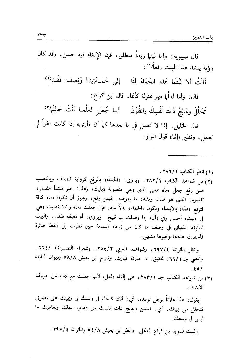 2 من شواهد الكتاب 1/ 282. ويروى "الحمام" بالرفع كرواية المصنف وبالنصب فمن رفع جعل "ما" بمعنى الذي وهي منصوبة "بليت" وهذا: خبر مبتدأ مضمر، تقديره: الذي هو هذا، ومثله: ما بعوضة. فيمن رفع، ويجوز أن تكون "ما" كافة فترفع "هذا" بالابتداء ويكون "الحمام" بدلا منه. فإن جعلت "ما" زائدة نصبت وهي في "ليت" أحسن وفي "أن" إذا وصلت بها قبيح. ويروى: أو نصفه فقد.. والبيت للنابغة الذبياني في وصف ما كان من زرقاء اليمامة حين نظرت إلى القطا طائرة فأحصت عددها وخبرها مشهور.