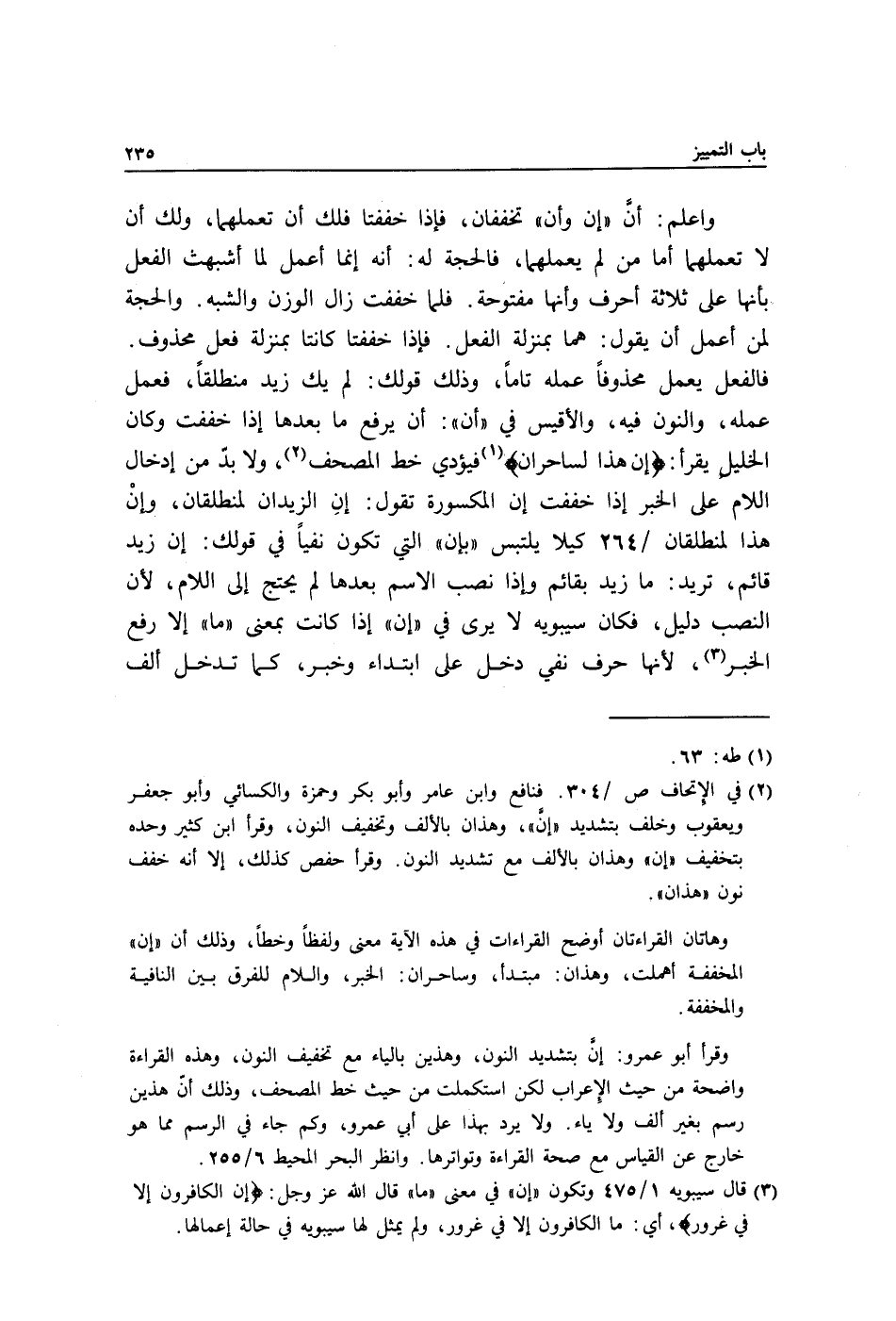 واعلم: أنَّ "إن وأن" تخففان, فإذا خففتا فلك أن تعملهما, ولك أن لا تعملهما أما من لم يعملهما, فالحجة له: أنه إنما أعمل لما أشبهت الفعل بأنها على ثلاثة أحرف وأنها مفتوحة. فلما خففت زال الوزن والشبه. والحجة لمن أعمل أن يقول: هما بمنزلة الفعل. فإذا خففتا كانتا بمنزلة فعل محذوف. فالفعل يعمل محذوفًا عمله تامًا وذلك قولك: لم يك زيد منطلقًا فعمل عمله والنون فيه والأقيس في "أن": أن يرفع ما بعدها إذا خففت وكان الخليل يقرأ: "إِنْ هَذَا لَسَاحِرَانِ"1 فيؤدي خط المصحف2, ولا بدّ من إدخال اللام على الخبر إذا خففت إن المكسورة تقول: إنِ الزيدان لمنطلقان, وإنْ هذا لمنطلقان/ 264 كيلا يلتبس "بإن" التي تكون نفيًا في قولك: إن زيد قائم, تريد: ما زيد بقائم وإذا نصب الاسم بعدها لم يحتج إلى اللام, لأن النصب دليل, فكان سيبويه لا يرى في "إن" إذا كانت بمعنى "ما" إلا رفع الخبر3 لأنها حرف نفي دخل على ابتداء وخبر, كما تدخل ألف
