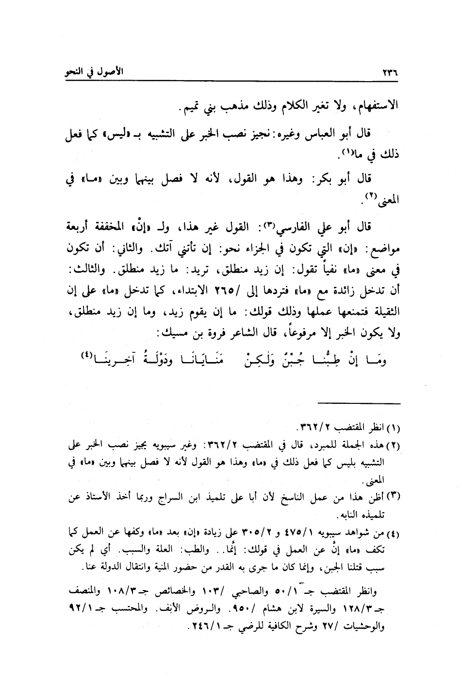 2 هذه الجملة للمبرد، قال في المقتضب 2/ 362: وغير سيبويه يجيز نصب الخبر على التشبيه بليس كما فعل ذلك في "ما" وهذا هو القول لأنه لا فصل بينهما وبين "ما" في المعنى.