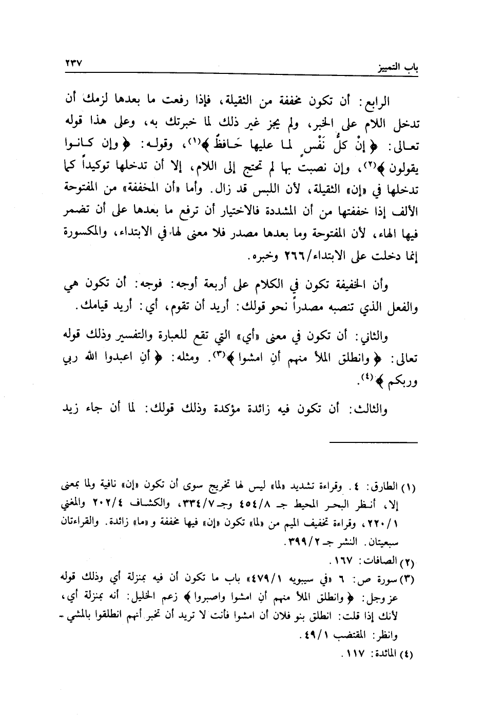 الرابع: أن تكون مخففة من الثقيلة, فإذا رفعت ما بعدها لزمك أن تدخل اللام على الخبر, ولم يجز غير ذلك لما خبرتك به, وعلى هذا قوله تعالى: {إِنْ كُلُّ نَفْسٍ لَمَّا عَلَيْهَا حَافِظٌ} 1 وقوله: {وَإِنْ كَانُوا يَقُولُون} 2, وإن نصبت بها لم تحتج إلى اللام, إلا أن تدخلها توكيدًا كما تدخلها في "إن" الثقيلة, لأن اللبس قد زال. وأما "أن المخففة" من المفتوحة الألف إذا خففتها من أن المشددة فالاختيار أن ترفع ما بعدها على أن تضمر فيها الهاء, لأن المفتوحة وما بعدها مصدر فلا معنى لها في الابتداء, والمكسورة إنما دخلت على الابتداء/ 266 وخبره.