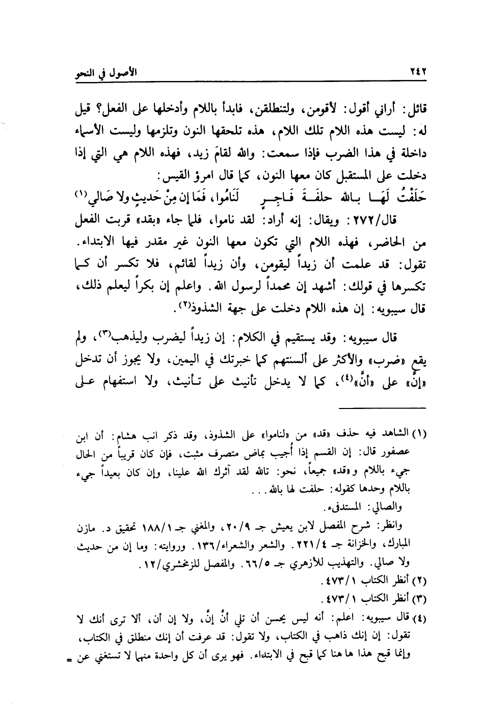 قائل: أراني أقول: لأقومن, ولتنطلقن, فأبدأ باللام وأدخلها على الفعل؟ قيل له: ليست هذه اللام تلك اللام, هذه تلحقها النون وتلزمها وليست الأسماء داخلة في هذا الضرب فإذا سمعت: والله لقامَ زيد, فهذه اللام هي التي إذا دخلت على المستقبل كان معها النون كما قال امرؤ القيس:
