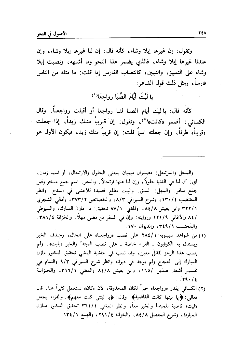 2 الكسائي يقدر "رواجعا" خبرا لكان المحذوفة، لأن "كان" تستعمل كثيرا هنا. قال تعالى: {يَا لَيْتَهَا كَانَتِ الْقَاضِيَةَ} وقال: {يَا لَيْتَنِي كُنْتُ مَعَهُمْ} . والفراء يجعل "ليت" ناصبة للمبتدأ والخبر معا، وانظر المغني 1/ 361 تحقيق الدكتور مازن المبارك، وشرح المفصل 8/ 84، والخزانة 4/ 291، والهمع 1/ 134.
