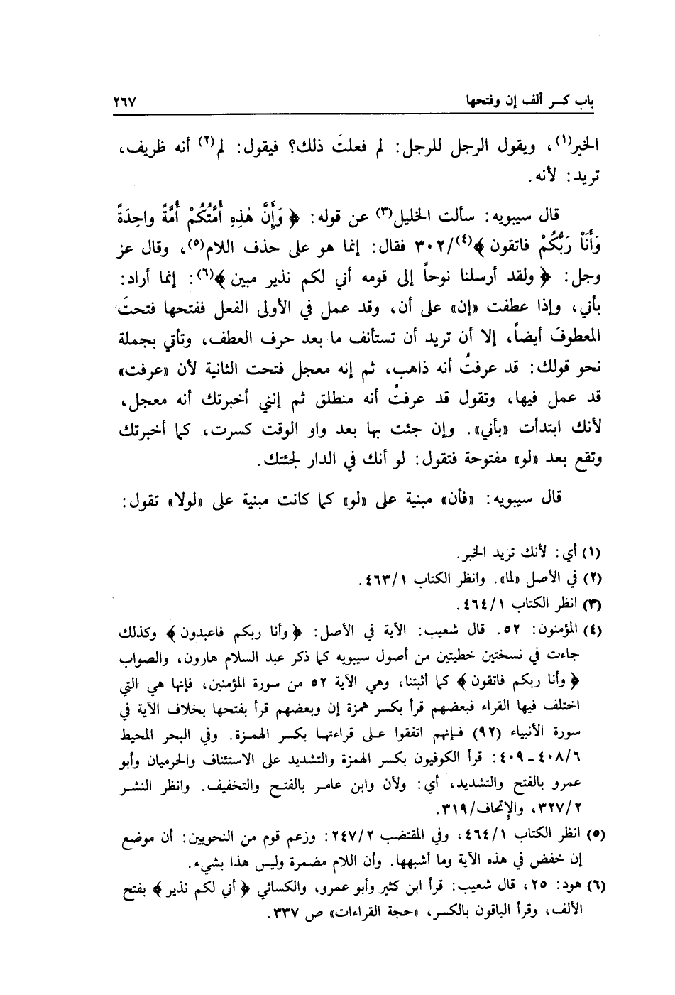 قال سيبويه: سألت الخليل3 عن قوله: {وَإِنَّ هَذِهِ أُمَّتُكُمْ أُمَّةً وَاحِدَةً وَأَنَا رَبُّكُمْ فَاتَّقُونِ} 4 / 302 فقال: إنما هو على حذف اللام5, وقال عز وجل: {وَلَقَدْ أَرْسَلْنَا نُوحًا إِلَى قَوْمِهِ إِنِّي لَكُمْ نَذِيرٌ مُبِين} 6: إنما أراد: بأني, وإذا عطفت "إن" على أن, وقد عمل في الأولى الفعل ففتحها فتحتَ المعطوفَ أيضًا, إلا أن تريد أن تستأنف ما بعد حرف العطف, وتأتي بجملة نحو قولك: قد عرفتُ أنه ذاهب, ثم إنه معجل فتحت الثانية لأن "عرفت" قد عمل فيها, وتقول قد عرفتُ أنه منطلق ثم إنني أخبرتك أنه معجل, لأنك ابتدأت "بأني". وإن جئت بها بعد واو الوقت كسرت, كما أخبرتك وتقع بعد "لو" مفتوحة فتقول: لو أنك في الدار لجئتك.