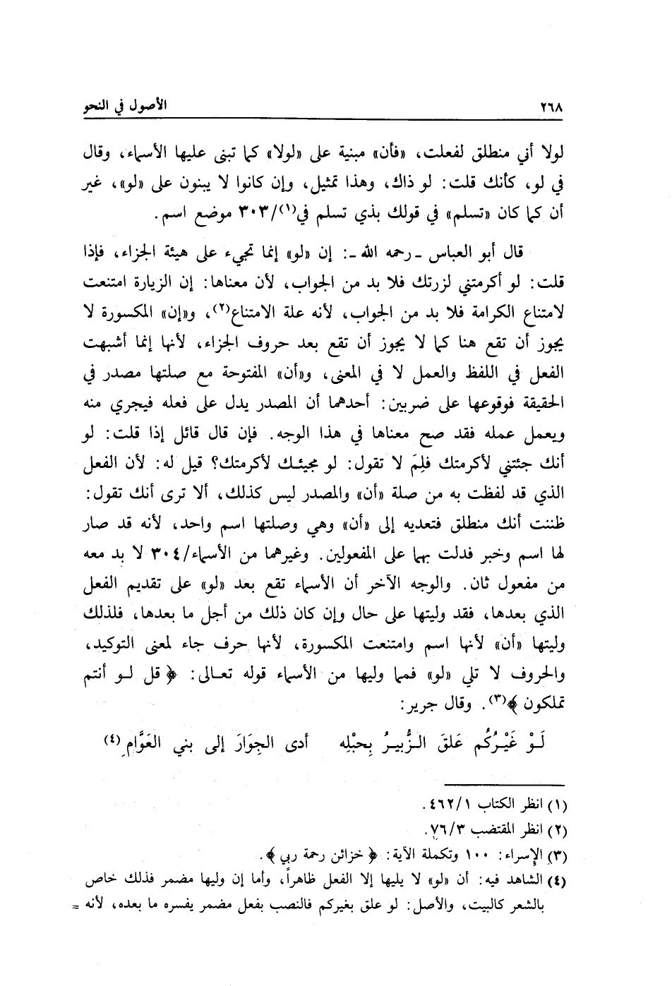 قال أبو العباس -رحمه الله: إن "لو" إنما تجيء على هيئة الجزاء, فإذا قلت: لو أكرمتني لزرتك فلا بد من الجواب, لأن معناها: إن الزيارة امتنعت لامتناع الكرامة فلا بد من الجواب, لأنه علة الامتناع2 و"إن" المكسورة لا يجوز أن تقع هنا كما لا يجوز أن تقع بعد حروف الجزاء, لأنها إنما أشبهت الفعل في اللفظ والعمل لا في المعنى و"أن" المفتوحة مع صلتها مصدر في الحقيقة فوقوعها على ضربين: أحدهما أن المصدر يدل على فعله فيجري منه ويعمل عمله فقد صح معناها في هذا الوجه. فإن قال قائل إذا قلت: لو أنك جئتني لأكرمتك فلِمَ لا تقول: لو مجيئك لأكرمتك, قيل له: لأن الفعل الذي قد لفظت به من صلة "أن" والمصدر ليس كذلك, ألا ترى أنك تقول: ظننت أنك منطلق فتعديه إلى "أن" وهي وصلتها اسم واحد؛ لأنه قد صار لها اسم وخبر فدلت بهما على المفعولين. وغيرهما من الأسماء/ 304 لا بد معه من مفعول ثان. والوجه الآخر أن الأسماء تقع بعد "لو" على تقديم الفعل الذي بعدها, فقد وليتها على حال وإن كان ذلك من أجل ما بعدها, فلذلك وليتها "أن", لأنها اسم وامتنعت المكسورة, لأنها حرف جاء لمعنى التوكيد, والحروف لا تلي "لو" فمما وليها من الأسماء قوله تعالى: {قُلْ لَوْ أَنْتُمْ تَمْلِكُونَ} 3. وقال جرير: