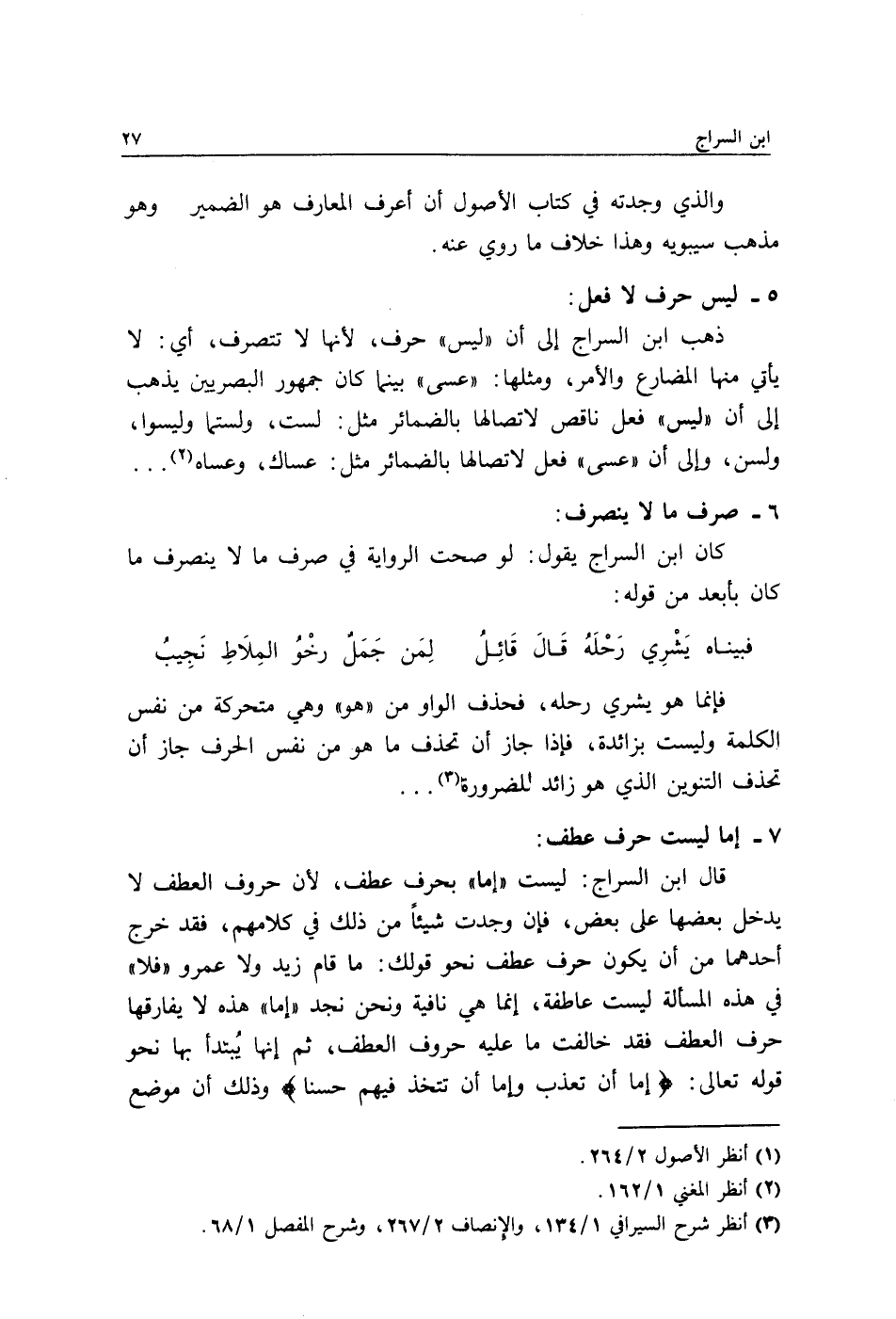 ذهب ابن السراج إلى أن "ليس" حرف؛ لأنها لا تتصرف، أي: لا يأتي منها المضارع والأمر، ومثلها: "عسى" بينما كان جمهور البصريين يذهب إلى أن "ليس" فعل ناقص لاتصالها بالضمائر مثل: لست، ولستما وليسوا، ولسن، وإلى أن "عسى" فعل لاتصالها بالضمائر مثل: عساك، وعساه2 ...