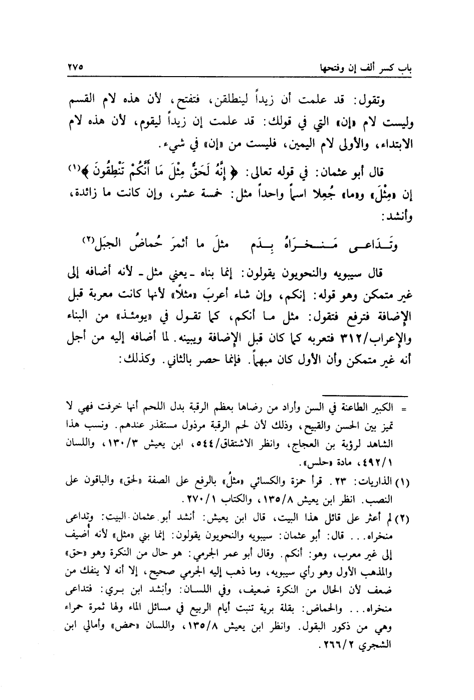 2 لم أعثر على قائل هذا البيت، قال ابن يعيش: أنشد أبو عثمان البيت: وتداعى منخراه ... قال: أبو عثمان: سيبويه والنحويون يقولون: إنما بني "مثل" لأنه أضيف إلى غير معرب، وهو: أنكم. وقال أبو عمر الجرمي: هو حال من النكرة وهو "حق" والمذهب الأول وهو رأي سيبويه، وما ذهب إليه الجرمي صحيح، إلا أنه لا ينفك من ضعف لأن الحال من النكرة ضعيف، وفي اللسان: وأنشد ابن بري: فتداعى منخراه ... والحماض: بقلة برية تنبت أيام الربيع في مسائل الماء ولها ثمرة حمراء وهي من ذكور البقول. وانظر ابن يعيش 8/ 135، واللسان "حمض" وأمالي ابن الشجري 2/ 266.