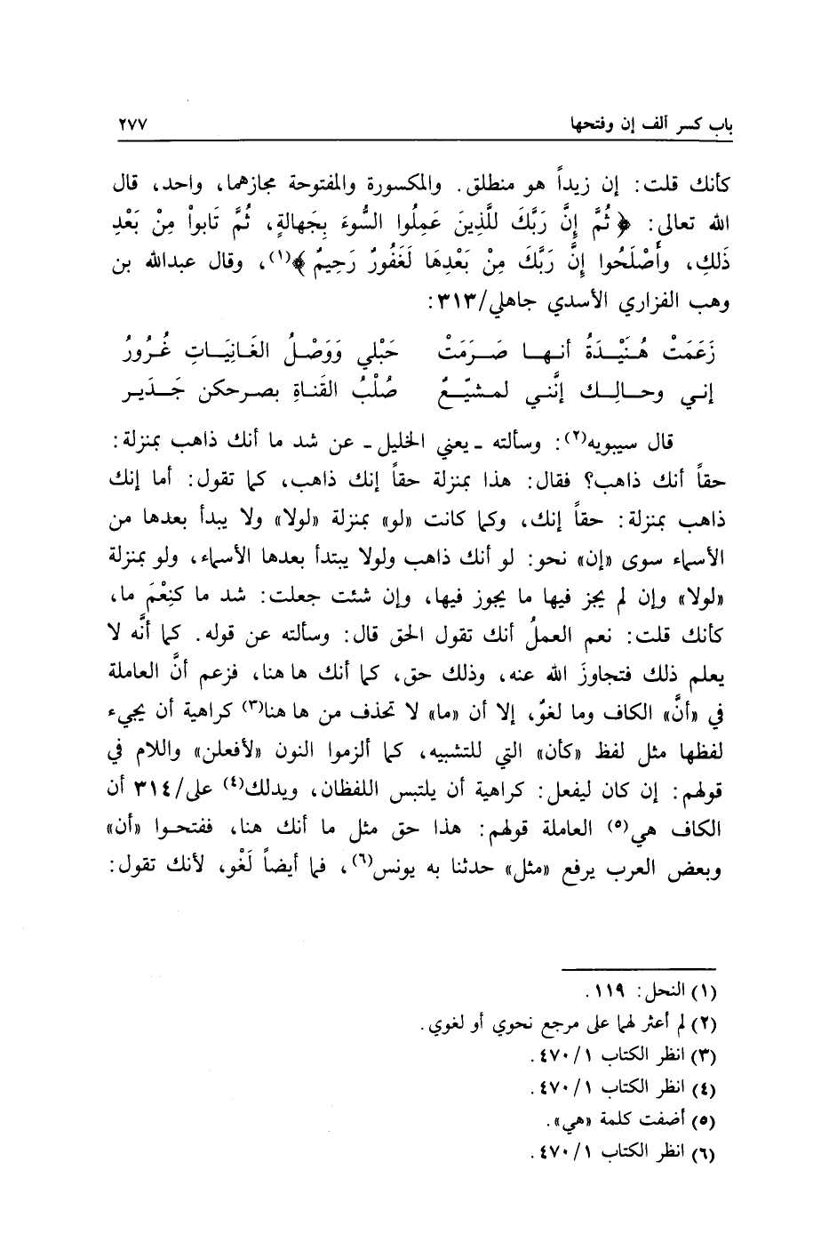 كأنك قلت: إن زيدًا هو منطلق. والمكسورة والمفتوحة مجازهما واحد قال الله تعالى: {ثُمَّ إِنَّ رَبَّكَ لِلَّذِينَ عَمِلُوا السُّوءَ بِجَهَالَةٍ ثُمَّ تَابُوا مِنْ بَعْدِ ذَلِكَ وَأَصْلَحُوا إِنَّ رَبَّكَ مِنْ بَعْدِهَا لَغَفُورٌ رَحِيمٌ} 1, وقال عبد الله بن وهب الفزاري الأسدي جاهلي/ 313: