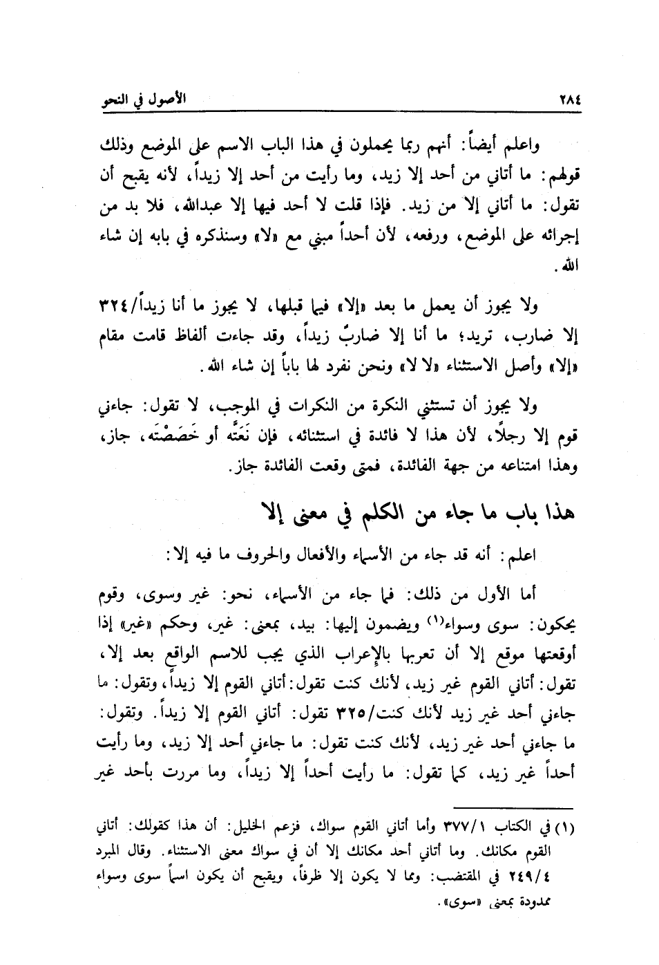 ولا يجوز أن يعمل ما بعد "إلا" فيما قبلها, لا يجوز ما أنا زيدًا/ 324 إلا ضارب, تريد, ما أنا إلا ضاربٌ زيدًا, وقد جاءت ألفاظ قامت مقام "إلا" وأصل الاستثناء "لا لا" ونحن نفرد لها بابًا إن شاء الله.