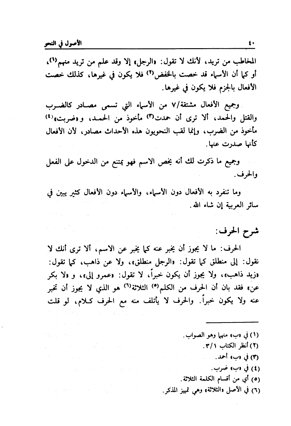 الحرف: ما لا يجوز أن يخبر عنه كما يخبر عن الاسم, ألا ترى أنك لا تقول: إلى منطلق كما تقول: "الرجل منطلق" ولا عن ذاهب, كما تقول: "زيد ذاهب" ولا يجوز أن يكون خبرًا, لا تقول: "عمرو إلى" و"لا بكر عن" فقد بان أن الحرف من الكلم1 الثلاثة2 هو الذي لا يجوز أن تخبر عنه ولا يكون خبرًا. والحرف لا يأتلف منه مع الحرف كلام, لو قلت