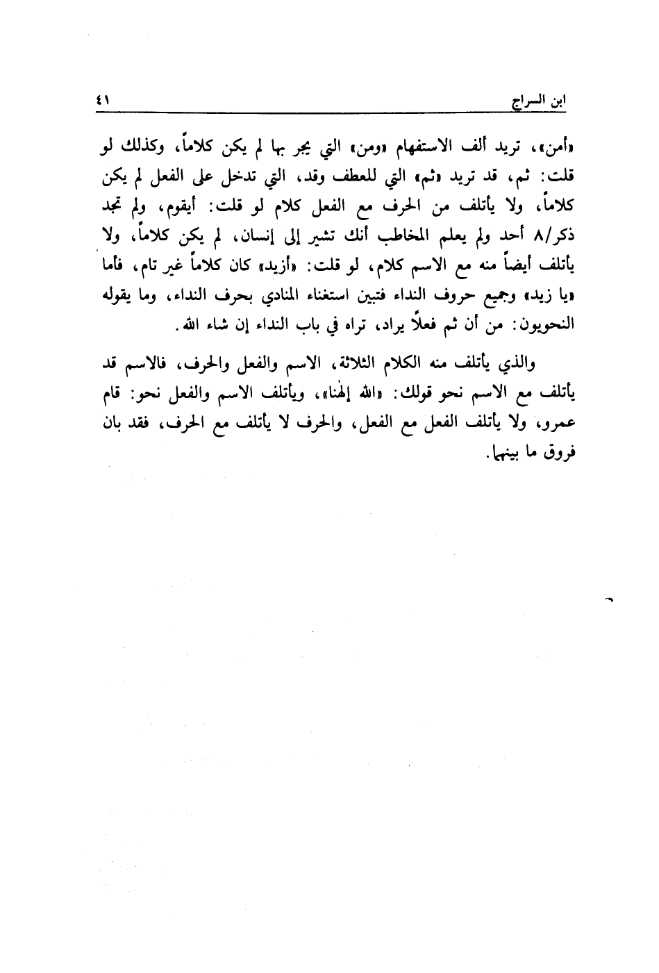 "أمن" تريد ألف الاستفهام "ومن" التي يجر بها لم يكن كلامًا, وكذلك لو قلت: ثم, قد تريد "ثم" التي للعطف وقد التي تدخل على الفعل لم يكن كلامًا, ولا يأتلف من الحرف مع الفعل كلام لو قلت: أيقوم, ولم تجد ذكر/ 8 أحد ولم يعلم المخاطب أنك تشير إلى إنسان, لم يكن كلامًا, ولا يأتلف أيضًا منه مع الاسم كلام, لو قلت: "أزيد" كان كلامًا غير تام, فأما "يا زيد" وجميع حروف النداء فتبين استغناء المنادي بحرف النداء, وما يقوله النحويون: من أن ثم فعلًا يراد, تراه في باب النداء إن شاء الله.