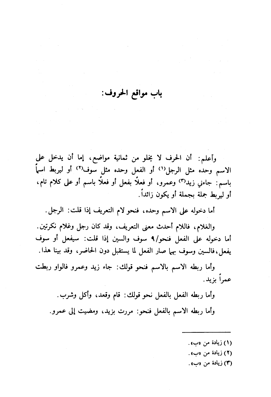 واعلم: أن الحرف لا يخلو من ثمانية مواضع, إما أن يدخل على الاسم وحده مثل الرجل1 أو الفعل وحده مثل سوف2 أو ليربط اسمًا باسم: جاءني زيد3 وعمرو, أو فعلًا بفعل أو فعلا باسم أو على كلام تام, أو ليربط جملة بجملة أو يكون زائدًا.