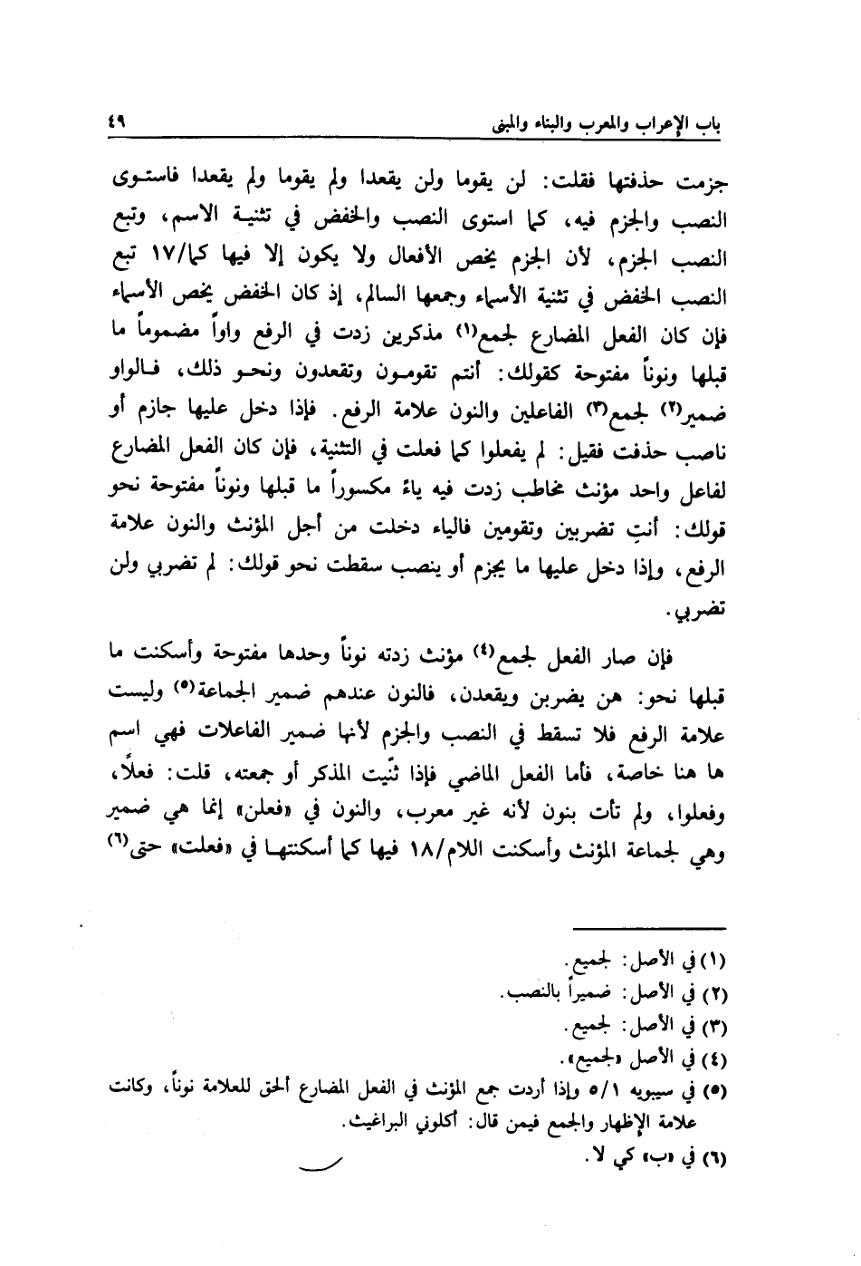 جزمت, حذفتها فقلت: لن يقوما ولن يقعدا ولم يقوما ولم يقعدا فاستوى النصب والجزم فيه, كما استوى النصب والخفض في تثنية الاسم, وتبع النصب الجزم؛ لأن الجزم يخص الأفعال ولا يكون إلا فيها كما/ 17 تبع النصب الخفض في تثنية الأسماء وجمعها السالم, إذ كان الخفض يخص الأسماء فإن كان الفعل المضارع لجمع1 مذكرين زدت في الرفع واوًا مضمومًا ما قبلها ونونًا مفتوحة كقولك: أنتم تقومون وتقعدون ونحو ذلك, فالواو ضمير2 لجمع3 الفاعلين والنون علامة الرفع. فإذا دخل عليها جازم أو ناصب حذفت فقيل: لم يفعلوا كما فعلت في التثنية, فإن كان الفعل المضارع لفاعل واحد مؤنث مخاطب زدت فيه ياءً مكسورًا ما قبلها ونونًا مفتوحة نحو قولك: أنتِ تضربين وتقومين فالياء دخلت من أجل المؤنث والنون علامة الرفع, وإذا دخل عليها ما يجزم أو ينصب سقطت نحو قولك: لم تضربي ولن تضربي.