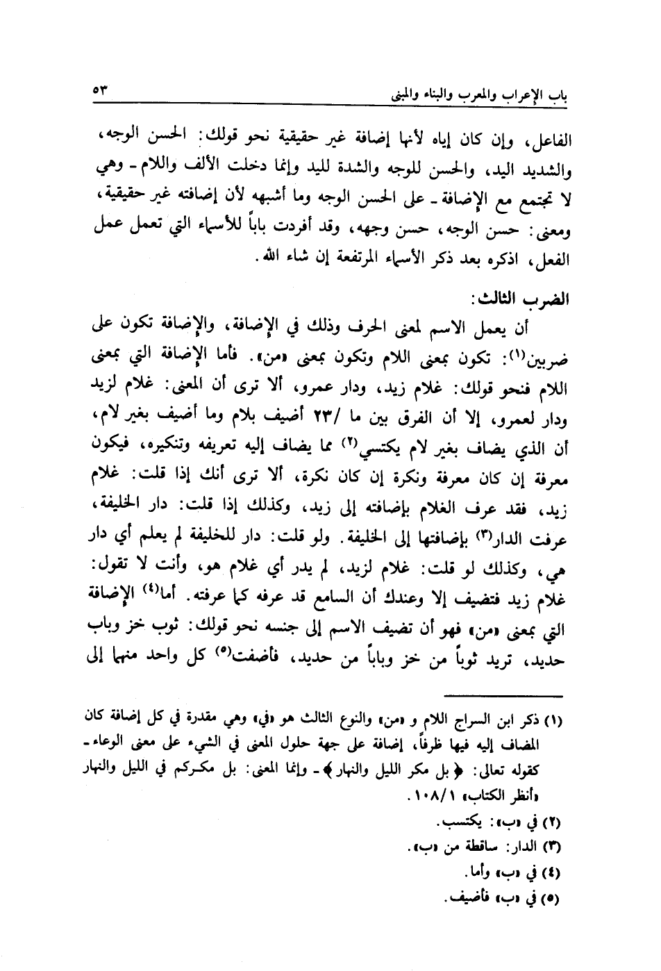 أن يعمل الاسم لمعنى الحرف وذلك في الإِضافة, والإِضافة تكون على ضربين1: تكون بمعنى اللام وتكون بمعنى "من". فأما الإِضافة التي بمعنى اللام فنحو قولك: غلام زيد, ودار عمرو, ألا ترى أن المعنى: غلام لزيد ودار لعمرو, إلا أن الفرق بين ما/ 23 أضيف بلام وما أضيف بغير لام, أن الذي يضاف بغير لام يكتسي2 مما يضاف إليه تعريفه وتنكيره, فيكون معرفة إن كان معرفة ونكرة إن كان نكرة, ألا ترى أنك إذا قلت: غلام زيد, فقد عرف الغلام بإضافته إلى زيد, وكذلك إذا قلت: دار الخليفة, عرفت الدار3 بإضافتها إلى الخليفة. ولو قلت: دار للخليفة, لم يعلم أي دار هي, وكذلك لو قلت: غلام لزيد, لم يدر أي غلام هو, وأنت لا تقول: غلام زيد فتضيف إلا وعندك أن السامع قد عرفه كما عرفته. أما4 الإِضافة التي بمعنى "من" فهو أن تضيف الاسم إلى جنسه نحو قولك: ثوب خز وباب حديد, تريد ثوبًا من خز وبابًا من حديد, فأضفت5 كل واحد منهما إلى