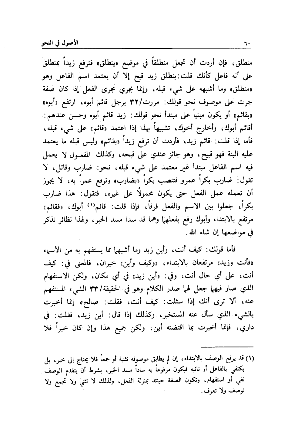 1 قد يرفع الوصف بالابتداء، إن لم يطابق موصوفه تثنية أو جمعا فلا يحتاج إلى خبر، بل يكتفي بالفاعل أو نائبه فيكون مرفوعا به سادا مسد الخبر، بشرط أن يتقدم الوصف نفي أو استفهام، وتكون الصفة حينئذ بمنزلة الفعل، ولذلك لا تثني ولا تجمع ولا توصف ولا تعرف.