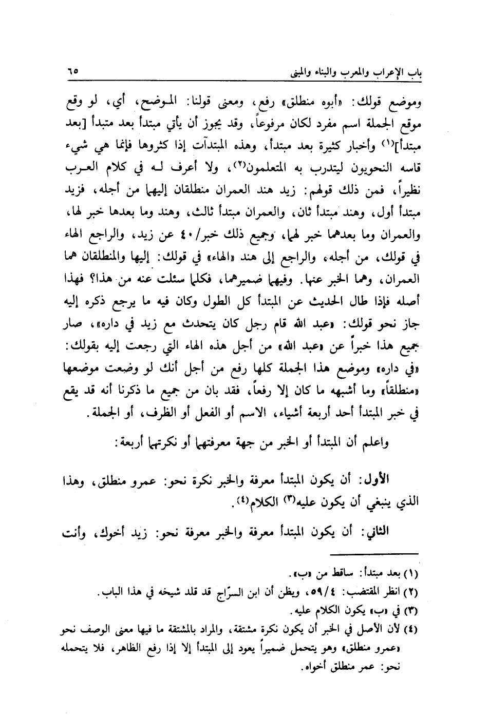 الأول: أن يكون المبتدأ معرفة والخبر نكرة نحو: عمرو منطلق: وهذا الذي ينبغي أن يكون عليه3 الكلام4.