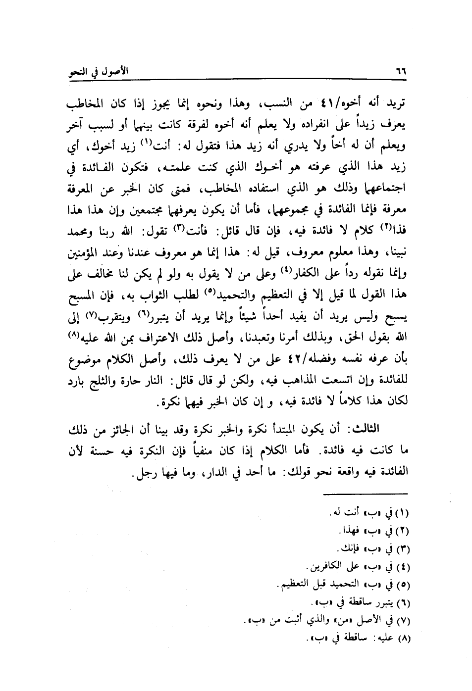 تريد أنه أخوه/ 41 من النسب, وهذا ونحوه إنما يجوز إذا كان المخاطب يعرف زيدًا على انفراده ولا يعلم أنه أخوه لفرقة كانت بينهما أو لسبب آخر ويعلم أن له أخًا ولا يدري أنه زيد هذا فتقول له: أنت1 زيد أخوك, أي: زيد هذا الذي عرفته هو أخوك الذي كنت علمته, فتكون الفائدة في اجتماعهما وذلك هو الذي استفاده المخاطب, فمتى كان الخبر عن المعرفة معرفة فإنما الفائدة في مجموعهما, فأما أن يكون يعرفهما مجتمعين وإن هذا هذا فذا2 كلام لا فائدة فيه, فإن قال قائل: فأنت3 تقول: الله ربنا ومحمد نبينا, وهذا معلوم معروف, قيل له: هذا إنما هو معروف عندنا وعند المؤمنين وإنما نقوله ردًّا على الكفار4 وعلى من لا يقول به ولو لم يكن لنا مخالف على هذا القول لما قيل إلا في التعظيم والتحميد5 لطلب الثواب به, فإن المسبح يسبح وليس يريد أن يفيد أحدًا شيئًا وإنما يريد أن يتبرر6 ويتقرب7 إلى الله بقول الحق, وبذلك أمرنا وتعبدنا, وأصل ذلك الاعتراف بمن الله عليه8 بأن عرفه نفسه وفضله/ 42 على من لا يعرف ذلك, وأصل الكلام موضوع للفائدة وإن اتسعت المذاهب فيه, ولكن لو قال قائل: النار حارة والثلج بارد لكان هذا كلامًا لا فائدة فيه, وإن كان الخبر فيهما نكرة.