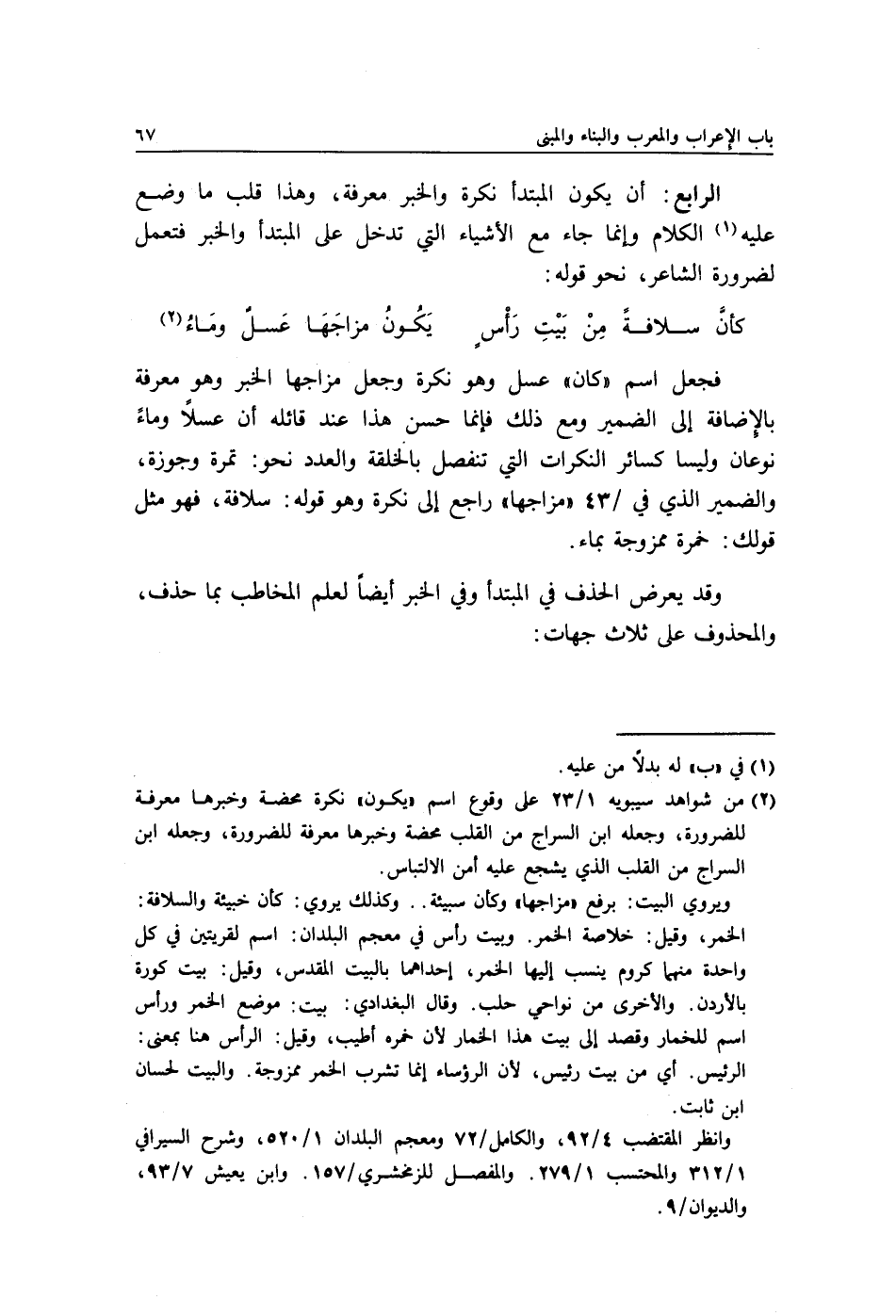 فجعل اسم "كان" عسل وهو نكرة وجعل مزاجها الخبر وهو معرفة بالإِضافة إلى الضمير ومع ذلك فإنما حسن هذا عند قائله أن عسلًا وماءً نوعان وليسا كسائر النكرات التي تنفصل بالخلقة والعدد نحو: تمرة وجوزة, والضمير الذي في/ 43 "مزاجها" راجع إلى نكرة وهو قوله: سلافة, فهو مثل قولك: خمرة ممزوجة بماء.