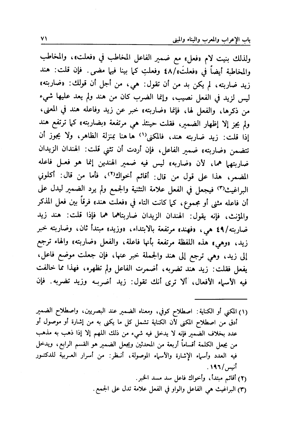 1 المكني أو الكناية: اصطلاح كوفي، ومعناه الضمير عند البصريين, واصطلاح الضمير أدق من اصطلاح المكنى لأن الكناية تشمل كل ما يكنى به من إشارة أو موصول أو عدد بخلاف الضمير فإنه لا يدخل فيه شيء من ذلك اللهم إلا إذا ذهب به مذهب من يجعل الكلمة أقساما أربعة من المحدثين ويجعل الضمير هو القسم الرابع، ويدخل فيه العدد وأسماء الإشارة والأسماء الموصولة، انظر: من أسرار العربية للدكتور أنيس/ 196.
