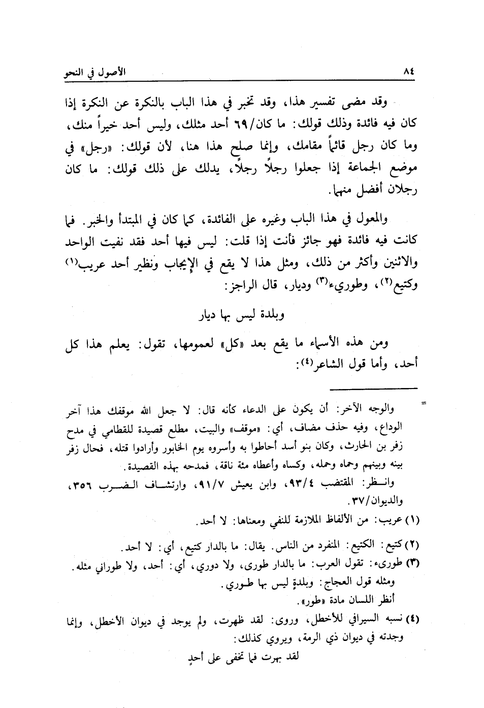 والمعول في هذا الباب وغيره على الفائدة, كما كان في المبتدأ والخبر. فما كانت فيه فائدة فهو جائز فأنت إذا قلت: ليس فيها أحد فقد نفيت الواحد والاثنين وأكثر من ذلك, ومثل هذا لا يقع في الإيجاب ونظير أحد عريب1 وكتيع2, وطورئ3 وديار, قال الراجز: