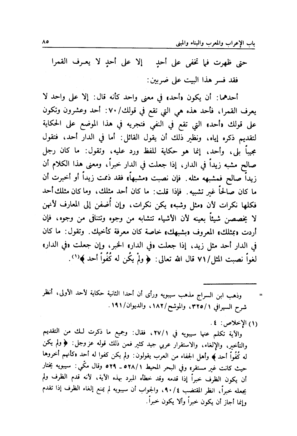أحدهما: أن يكون "أحد" في معنى واحد كأنه قال: إلا على واحد لا يعرف القمرا, فأحد هذه هي التي تقع في قولك/70: أحد وعشرون وتكون على قولك "أحد" التي تقع في النفي فتجريه في هذا الموضع على الحكاية لتقديم ذكره إياه, ونظير ذلك أن يقول القائل: أما في الدار أحد, فتقول مجيبًا بلى, وأحد, إنما هو حكاية للفظ ورد عليه, وتقول: ما كان رجل صالح مشبه زيدًا في الدار, إذا جعلت في الدار خبرًا, ومعنى هذا الكلام أن زيدًا صالح فمشبهه مثله. فإن نصبت "مشبهًا" فقد ذممت زيدًا أو أخبرت أن ما كان صالحًا غير تشبيه. فإذا قلت: ما كان أحد مثلك, وما كان مثلك أحد فكلها نكرات لأن "مثل وشبه" يكن نكرات, وإن أَضفن إلى المعارف لأنهن لا يخصصن شيئًا بعينه لأن الأشياء تتشابه من وجوه, وتتنافى من وجوه, فإن أردت "بمثلك" المعروف "بشبهك" خاصة كان معرفة كأخيك. وتقول: ما كان في الدار أحد مثل زيد, إذا جعلت "في الدار" الخبر, وإن جعلت "في الدار" لغوًا نصبت المثل/ 71 قال الله تعالى: {وَلَمْ يَكُنْ لَهُ كُفُوًا أَحَد} 1.