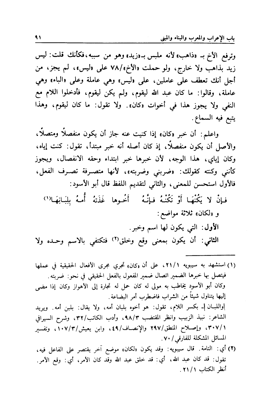 2 أي: التامة. قال سيبويه: وقد يكون "لكان" موضع آخر يقتصر على الفاعل فيه، تقول: قد كان عبد الله، أي: قد خلق عبد الله وقد كان الأمر، أي: وقع الأمر. انظر الكتاب 1/ 21.