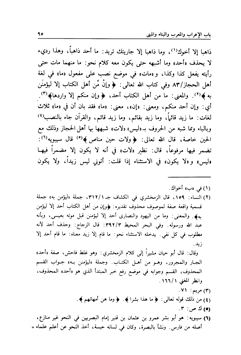 ذاهبا إلا أخوك1, وما ذاهبا إلا جاريتك تريد: ما أحد ذاهبًا, وهذا رديء لا يحذف "أحد" وما أشبهه حتى يكون معه كلام نحو: ما منهما مات حتى رأيته يفعل كذا وكذا, و"مات" في موضع نصب على مفعول "ما" في لغة أهل الحجاز/ 83 وفي كتاب الله تعالى: {وَإِنْ مِنْ أَهْلِ الْكِتَابِ إِلَّا لَيُؤْمِنَنَّ بِه} 2. والمعنى: ما من أهل الكتاب أحد, {وَإِنْ مِنْكُمْ إِلَّا وَارِدُهَا} 3. أي: وإن أحد منكم, ومعنى: "إن" معنى: "ما" فقد بان أن في "ما" ثلاث لغات: ما زيد قائمًا وما زيد بقائم وما زيد قائم, والقرآن جاء بالنصب4 وبالباء ومما شبه من الحروف بـ"ليس" "لات" شبهها بها أهل الحجاز وذلك مع الحين خاصة, قال الله تعالى: {وَلاتَ حِينَ مَنَاص} 5 قال سيبويه6: تضمر فيها مرفوعًا, قال: نظير "لات" في أنه لا يكون إلا مضمرًا فيها "ليس" و"لا يكون" في الاستثناء إذا قلت: أتوني ليس زيدًا, ولا يكون