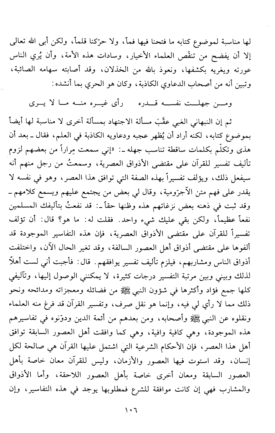 ثم إن النبهاني الغبي عقَّبَ مسألة الاجتهاد بمسألة أخرى لا مناسبة لها أيضاً بموضوع كتابه، لكنه أراد أن يُظهر عجبه ودعاويه الكاذبة في العلم، فقال -بعد أن هذى وتكلّم بكلمات ساقطة تناسب جهله-: "إني سمعت مِراراً من بعضهم لزوم تأليف تفسير للقرآن على مقتضى الأذواق العصرية، وسمعتُ من رجل منهم أنه سيفعل ذلك، ويؤلف تفسيراً بهذه الصفة التي توافق هذا العصر، وهو في نفسه لا يقدر على فهم متن الآجرّومية، وقال لي بعض من يجتمع عليهم ويسمع كلامهم -وقد ثبت في ذهنه بعض نزغاتهم هذه وظنها حقاً-: قد نفعتُ بتأليفك المسلمين نفعاً عظيماً، ولكن بقي عليك شيء واحد. فقلت له: ما هو؟ قال: أن تؤلف تفسيراً للقرآن على مقتضى الأذواق العصرية، فإن هذه التفاسير الموجودة قد ألفوها على مقتضى أذواق أهل العصور السالفة، وقد تغير الحال الآن، واختلفت أذواق الناس ومشاربهم، فيلزم تأليف تفسير يوافقهم. قال: فأجبت أني لست أهلاً لذلك وبيني وبين مرتبة التفسير درجات كثيرة، لا يمكنني الوصول إليها، وتآليفي كلها جمع فؤاد وأكثرها في شؤون النبي صلى الله عليه وسلم من فضائله ومعجزاته ومدائحه ونحو ذلك مما لا رأي لي فيه، وإنما هو نقل صرف، وتفسير القرآن قد فرغ منه العلماء ونقلوه عن النبي صلى الله عليه وسلم وأصحابه، ومن بعدهم من أئمة الدين ودوّنوه في تفاسيرهم هذه الموجودة، وهي كافية وافية، وهي كما وافقت أهل العصور السابقة توافق أهل هذا العصر، فإن الأحكام الشرعية التي اشتمل عليها القرآن هي صالحة لكل إنسان، وقد استوت فيها العصور والأزمان، وليس للقرآن معان خاصة بأهل العصور السابقة ومعان أخرى خاصة بأهل العصور اللاحقة، وأما الأذواق والمشارب فهي إن كانت موافقة للشرع فمطلوبها يوجد في هذه التفاسير، وإن