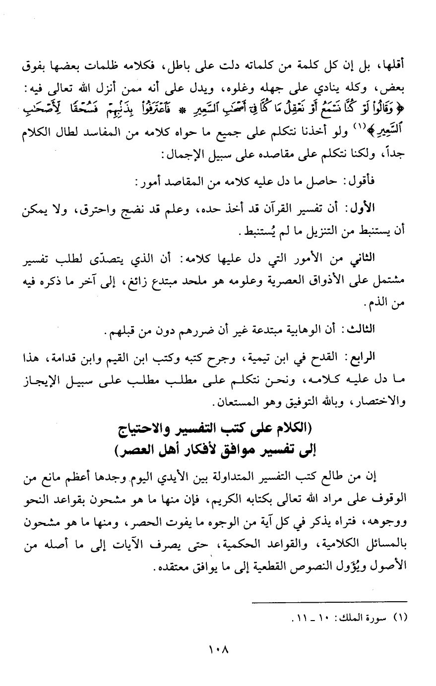 أقلها، بل إن كل كلمة من كلماته دلت على باطل، فكلامه ظلمات بعضها فوق بعض، وكله ينادي على جهله وغلوه، ويدل على أنه ممن أنزل الله تعالى فيه: {وَقَالُوا لَوْ كُنَّا نَسْمَعُ أَوْ نَعْقِلُ مَا كُنَّا فِي أَصْحَابِ السَّعِيرِ * فَاعْتَرَفُوا بِذَنْبِهِمْ فَسُحْقاً لِأَصْحَابِ السَّعِيرِ} 1 ولو أخذنا نتكلم على جميع ما حواه كلامه من المفاسد لطال الكلام جداً، ولكنا نتكلم على مقاصده على سبيل الإجمال: