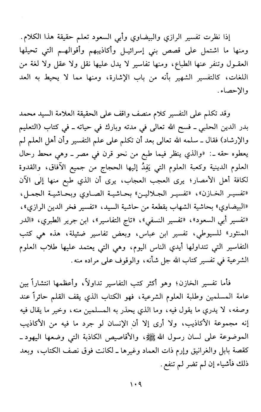 وقد تكلم على التفسير كلام منصف واقف على الحقيقة العلامة السيد محمد بدر الدين الحلبي- فسح الله تعالى في مدته وبارك في حياته- في كتاب (التعليم والإرشاد) فقال- سلمه الله تعالى بعد أن تكلم على علم التفسير وأن أهل العلم لم يعطوه حقه-: "والذي ينظر فيما طبع من نحو قرن في مصر- وهي محط رحال العلوم الدينية وكعبة العلوم التي يَفِدُ إليها الحجاج من جميع الآفاق، والقدوة لكافة أهل الأمصار؛ يرى العجب العجاب، يرى أن الذي طبع منها إلى الآن "تفسير الخازن"، "تفسير الجلالين" بحاشية الصاوي وبحاشية الجمل، "البيضاوي" بحاشية الشهاب بقطعة من حاشية السيد، "تفسير فخر الدين الرازي"، "تفسير أبي السعود"، "تفسير النسفي"، "تاج التفاسير"، ابن جرير الطبري، "الدر المنثور" للسيوطي، تفسير ابن عباس، وبعض تفاسير ضئيلة، هذه هي كتب التفاسير التي تتداولها أيدي الناس اليوم، وهي التي يعتمد عليها طلاب العلوم الشرعية في تفسير كتاب الله جل شأنه، والوقوف على مراده منه.
