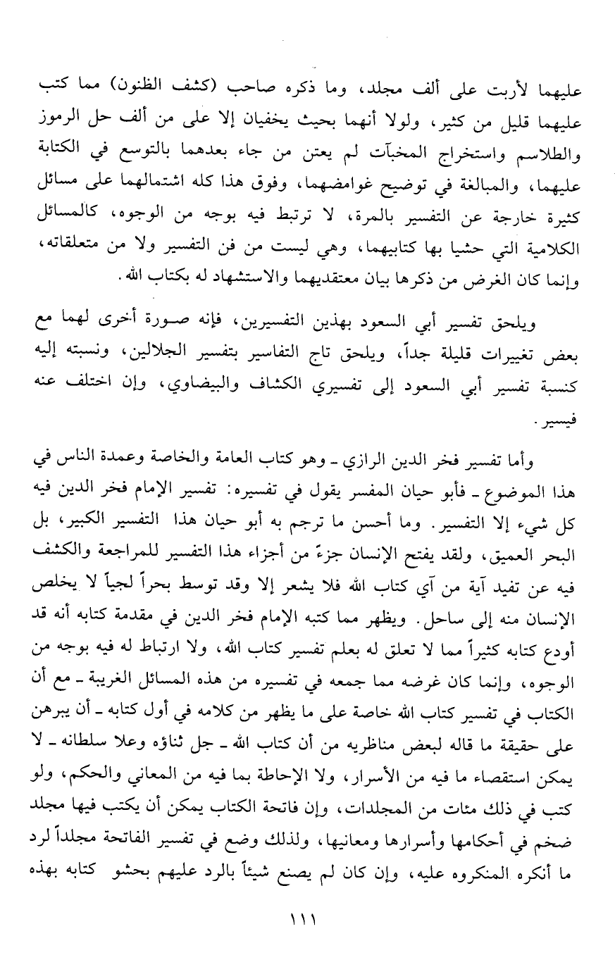 وأما تفسير فخر الدين الرازي- وهو كتاب العامة والخاصة وعمدة الناس في هذا الموضوع- فأبو حيان المفسر يقول في تفسيره: تفسير الإمام فخر الدين فيه كل شيء إلا التفسير. وما أحسن ما ترجم به أبو حيان هذا التفسير الكبير، بل البحر العميق، ولقد يفتح الإنسان جزءً من أجزاء هذا التفسير للمراجعة والكشف فيه عن تفيد آية من آي كتاب الله فلا يشعر إلا وقد توسط بحراً لجياً لا يخلص الإنسان منه إلى ساحل. ويظهر مما كتبه الإمام فخر الدين في مقدمة كتابه أنه قد أودع كتابه كثيراً مما لا تعلق له بعلم تفسير كتاب الله، ولا ارتباط له فيه بوجه من الوجوه، وإنما كان غرضه مما جمعه في تفسيره من هذه المسائل الغريبة- مع أن الكتاب في تفسير كتاب الله خاصة على ما يظهر من كلامه في أول كتابه- أن يبرهن على حقيقة ما قاله لبعض مناظريه من أن كتاب الله- جل ثناؤه وعلا سلطانه- لا يمكن استقصاء ما فيه من الأسرار، ولا الإحاطة بما فيه من المعاني والحكم، ولو كتب في ذلك مئات من المجلدات، وإن فاتحة الكتاب يمكن أن يكتب فيها مجلد ضخم في أحكامها وأسرارها ومعانيها، ولذلك وضح في تفسير الفاتحة مجلداً لرد ما أنكره المنكروه عليه، وإن كان لم يصنع شيئاً بالرد عليهم بحشو كتابه بهذه