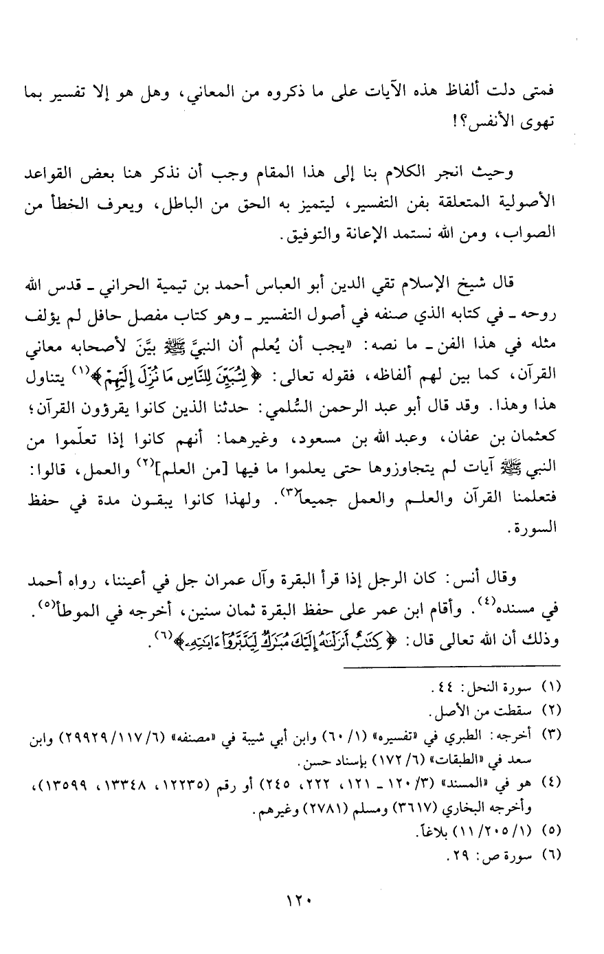قال شيخ الإسلام تقي الدين أبو العباس أحمد بن تيمية الحراني- قدس الله روحه- في كتابه الذي صنفه في أصول التفسير- وهو كتاب مفصل حافل لم يؤلف مثله في هذا الفن- ما نصه: "يجب أن يُعلم أن النبيَّ صلى الله عليه وسلم بيَّنَ لأصحابه معاني القرآن، كما بين لهم ألفاظه، فقوله تعالى: {لِتُبَيِّنَ لِلنَّاسِ مَا نُزِّلَ إِلَيْهِمْ} 1 يتناول هذا وهذا. وقد قال أبو عبد الرحمن السُّلمي: حدثنا الذين كانوا يقرؤون القرآن؛ كعثمان بن عفان، وعبد الله بن مسعود، وغيرهما: أنهم كانوا إذا تعلّموا من النبي صلى الله عليه وسلم آيات لم يتجاوزوها حتى يعلموا ما فيها [من العلم] 2 والعمل، قالوا: فتعلمنا القرآن والعلم والعمل جميعاً3. ولهذا كانوا يبقون مدة في حفظ السورة.