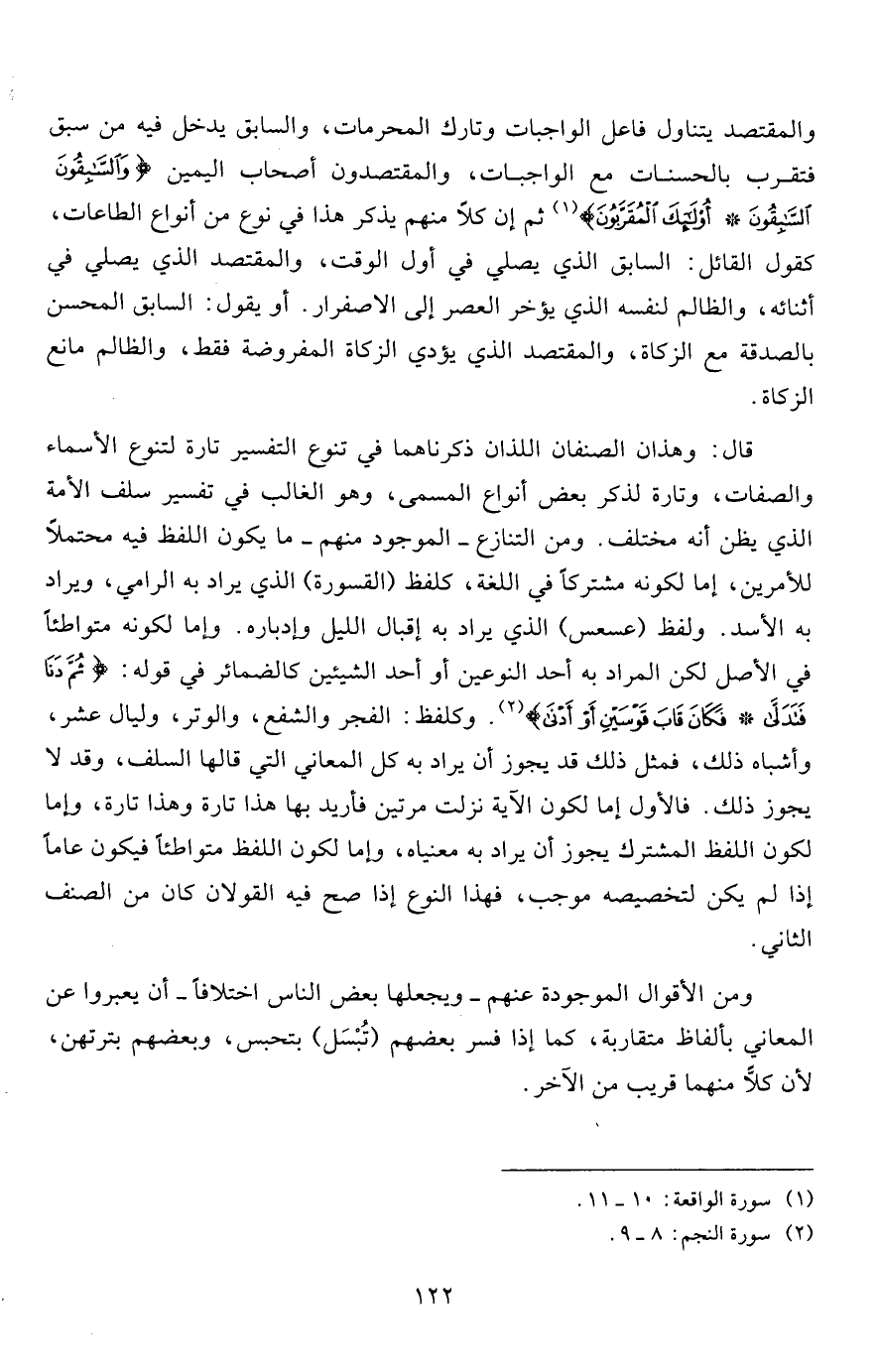 قال: وهذان الصنفان اللذان ذكرناهما في تنوع التفسير تارة لتنوع الأسماء والصفات، وتارة لذكر بعض أنواع المسمى، وهو الغالب في تفسير سلف الأمة الذي يظن أنه مختلف. ومن التنازع -الموجود منهم- ما يكون اللفظ فيه محتملاً للأمرين، إما لكونه مشتركاً في اللغة، كلفظ (القسورة) الذي يراد به الرامي، ويراد به الأسد. ولفظ (عسعس) الذي يراد به إقبال الليل وإدباره. وإما لكونه متواطئاً في الأصل لكن المراد به أحد النوعين أو أحد الشيئين كالضمائر في قوله: {ثُمَّ دَنَا فَتَدَلَّى * فَكَانَ قَابَ قَوْسَيْنِ أَوْ أَدْنَى} 2. وكلفظ: الفجر والشفع، والوتر، وليال عشر، وأشباه ذلك، فمثل ذلك قد يجوز أن يراد به كل المعاني التي قالها السلف، وقد لا يجوز ذلك. فالأول إما لكون الآية نزلت مرتين فأريد بها هذا تارة وهذا تارة، وإما لكون اللفظ المشترك يجوز أن يراد به معنياه، وإما لكون اللفظ متواطئاً فيكون عاماً إذا لم يكن لتخصيصه موجب، فهذا النوع إذا صح فيه القولان كان من الصنف الثاني.