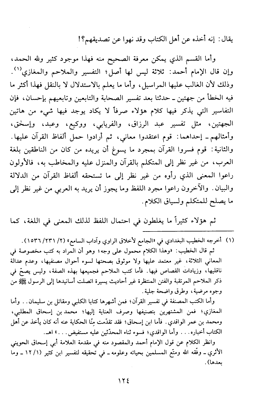 وانظر الكلام عن قول الإمام أحمد والمقصود منه في مقدمة العلامة أبي إسحاق الحويني الأثري- وفّقه الله ومتع المسلمين بحياته وعلومه- في تحقيقه لتفسير ابن كثير (1/ 12- وما بعدها) .