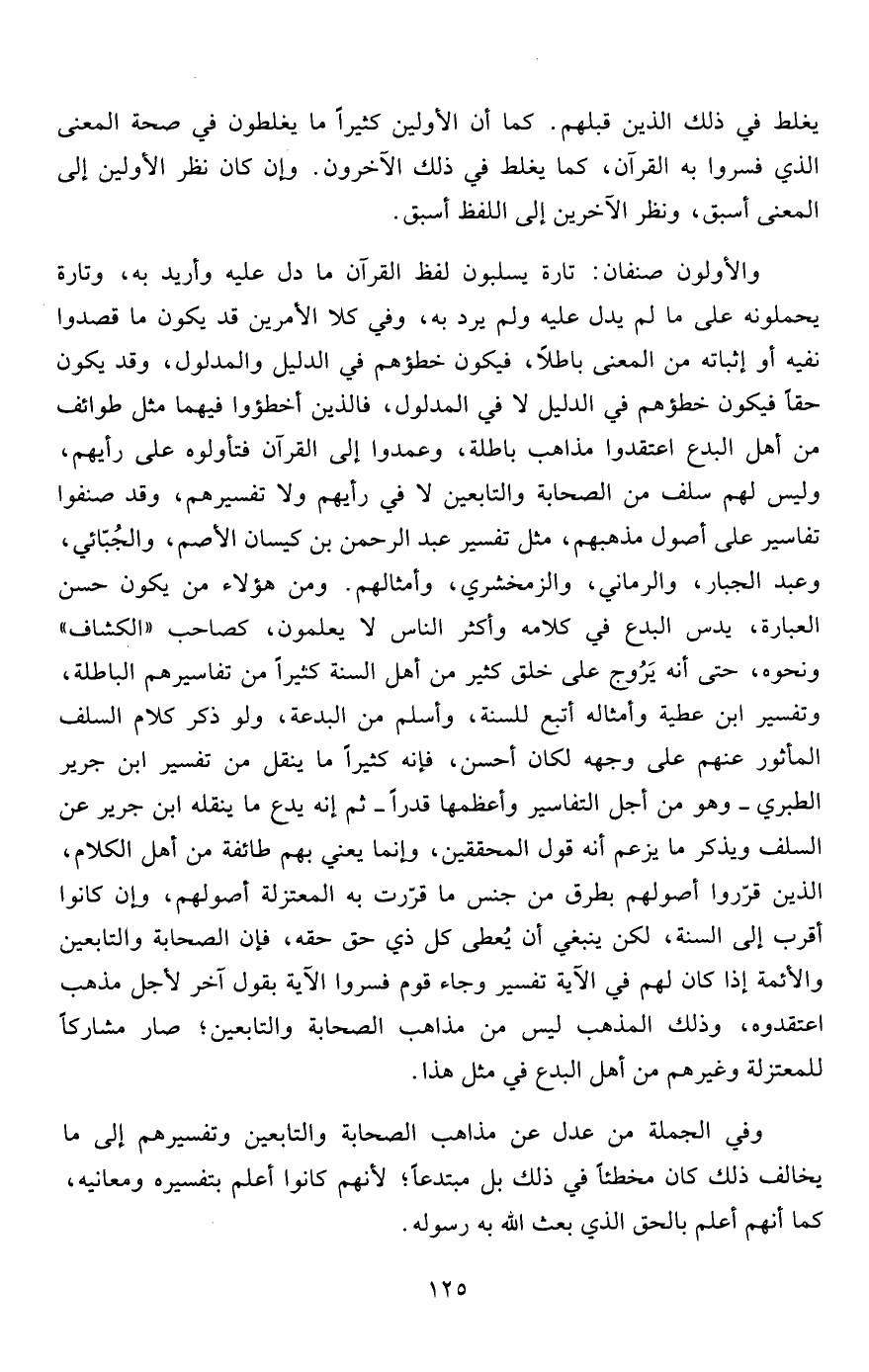 والأولون صنفان: تارة يسلبون لفظ القرآن ما دل عليه وأريد به، وتارة يحملونه على ما لم يدل عليه ولم يرد به، وفي كلا الأمرين قد يكون ما قصدوا نفيه أو إثباته من المعنى باطلاً، فيكون خطؤهم في الدليل والمدلول، وقد يكون حقاً فيكون خطؤهم في الدليل لا في المدلول، فالذين أخطؤوا فيهما مثل طوائف من أهل البدع اعتقدوا مذاهب باطلة، وعمدوا إلى القرآن فتأولوه على رأيهم، وليس لهم سلف من الصحابة والتابعين لا في رأيهم ولا تفسيرهم، وقد صنفوا تفاسير على أصول مذهبهم، مثل تفسير عبد الرحمن بن كيسان الأصم، والجُبّائي، وعبد الجبار، والرماني، والزمخشري، وأمثالهم. ومن هؤلاء من يكون حسن العبارة، يدس البدع في كلامه وأكثر الناس لا يعلمون، كصاحب "الكشاف"ونحوه، حتى أنه يَرُوج على خلق كثير من أهل السنة كثيراً من تفاسيرهم الباطلة، وتفسير ابن عطية وأمثاله أتبع للسنة، وأسلم من البدعة، ولو ذكر كلام السلف المأثور عنهم على وجهه لكان أحسن، فإنه كثيراً ما ينقل من تفسير ابن جرير الطبري- وهو من أجل التفاسير وأعظمها قدراً- ثم إنه يدع ما ينقله ابن جرير عن السلف ويذكر ما يزعم أنه قول المحققين، وإنما يعني بهم طائفة من أهل الكلام، الذين قرّروا أصولهم بطرق من جنس ما قرّرت به المعتزلة أصولهم، وإن كانوا أقرب إلى السنة، لكن ينبغي أن يُعطى كل ذي حق حقه، فإن الصحابة والتابعين والأئمة إذا كان لهم في الآية تفسير وجاء قوم فسروا الآية بقول آخر لأجل مذهب اعتقدوه، وذلك المذهب ليس من مذاهب الصحابة والتابعين؛ صار مشاركاً للمعتزلة وغيرهم من أهل البدع في مثل هذا.