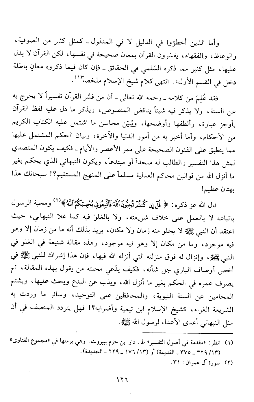 قال الله عز ذكره: {قُلْ إِنْ كُنْتُمْ تُحِبُّونَ اللَّهَ فَاتَّبِعُونِي يُحْبِبْكُمُ اللَّهُ} 2 ومحبة الرسول باتباعه لا بالعمل على خلاف شريعته، ولا بالغلوّ فيه كما غلا النبهاني، حيث اعتقد أن النبي صلى الله عليه وسلم لا يخلو منه زمان ولا مكان، يريد بذلك أنه ما من زمان إلا وهو فيه موجود، وما من مكان إلا وهو فيه موجود، وهذه مقالة شنيعة في الغلو في النبي صلى الله عليه وسلم، وإنزال له فوق منزلته التي أنزله الله فيها، فإن هذا إشراك للنبي صلى الله عليه وسلم في أخص أوصاف الباري جل شأنه، فكيف يدّعي محبته من يقول بهذه المقالة، ثم يصرف عمره في الحكم بغير ما أنزل الله، ويذب عن البدع ويحث عليها، ويشتم المحامين عن السنة النبوية، والمحافظين على التوحيد، وسائر ما وردت به الشريعة الغراء، كشيخ الإسلام ابن تيمية وأضرابه؟! فهل يتردد المنصف في أن مثل النبهاني أعدى الأعداء لرسول الله صلى الله عليه وسلم.