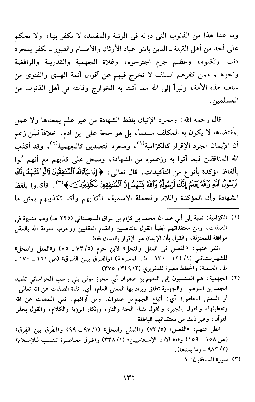 قال رحمه الله: ومجرد الإتيان بلفظ الشهادة من غير علم بمعناها ولا عمل بمقتضاها لا يكون به المكلف مسلماً، بل هو حجة على ابن آدم، خلافاً لمن زعم أن الإيمان مجرد الإقرار كالكرّامية1، ومجرد التصديق كالجهمية2، وقد أكذب الله المنافقين فيما أتوا به وزعموه من الشهادة، وسجل على كذبهم مع أنهم أتوا بألفاظ مؤكدة بأنواع من التأكيدات، قال تعالى: {إِذَا جَاءَكَ الْمُنَافِقُونَ قَالُوا نَشْهَدُ إِنَّكَ لَرَسُولُ اللَّهِ وَاللَّهُ يَعْلَمُ إِنَّكَ لَرَسُولُهُ وَاللَّهُ يَشْهَدُ إِنَّ الْمُنَافِقِينَ لَكَاذِبُونَ} 3. فأكدوا بلفظ الشهادة وأن المؤكدة واللام والجملة الاسمية، فأكذبهم وأكد تكذيبهم بمثل ما