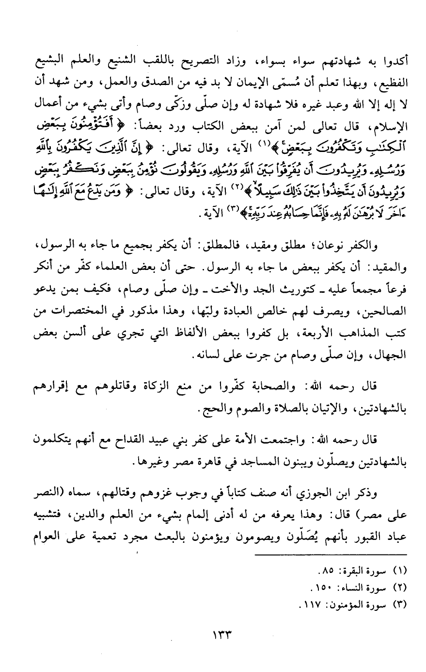 أكدوا به شهادتهم سواء بسواء، وزاد التصريح باللقب الشنيع والعلم البشيع الفظيع، وبهذا تعلم أن مُسمّى الإيمان لا بد فيه من الصدق والعمل، ومن شهد أن لا إله إلا الله وعبد غيره فلا شهادة له وإن صلّى وزكّى وصام وأتى بشيء من أعمال الإسلام، قال تعالى لمن آمن ببعض الكتاب ورد بعضاً: {أَفَتُؤْمِنُونَ بِبَعْضِ الْكِتَابِ وَتَكْفُرُونَ بِبَعْضٍ} 1 الآية، وقال تعالى: {إِنَّ الَّذِينَ يَكْفُرُونَ بِاللَّهِ وَرُسُلِهِ وَيُرِيدُونَ أَنْ يُفَرِّقُوا بَيْنَ اللَّهِ وَرُسُلِهِ وَيَقُولُونَ نُؤْمِنُ بِبَعْضٍ وَنَكْفُرُ بِبَعْضٍ وَيُرِيدُونَ أَنْ يَتَّخِذُوا بَيْنَ ذَلِكَ سَبِيلاً} 2 الآية، وقال تعالى: {وَمَنْ يَدْعُ مَعَ اللَّهِ إِلَهاً آخَرَ لا بُرْهَانَ لَهُ بِهِ فَإِنَّمَا حِسَابُهُ عِنْدَ رَبِّهِ} 3 الآية.