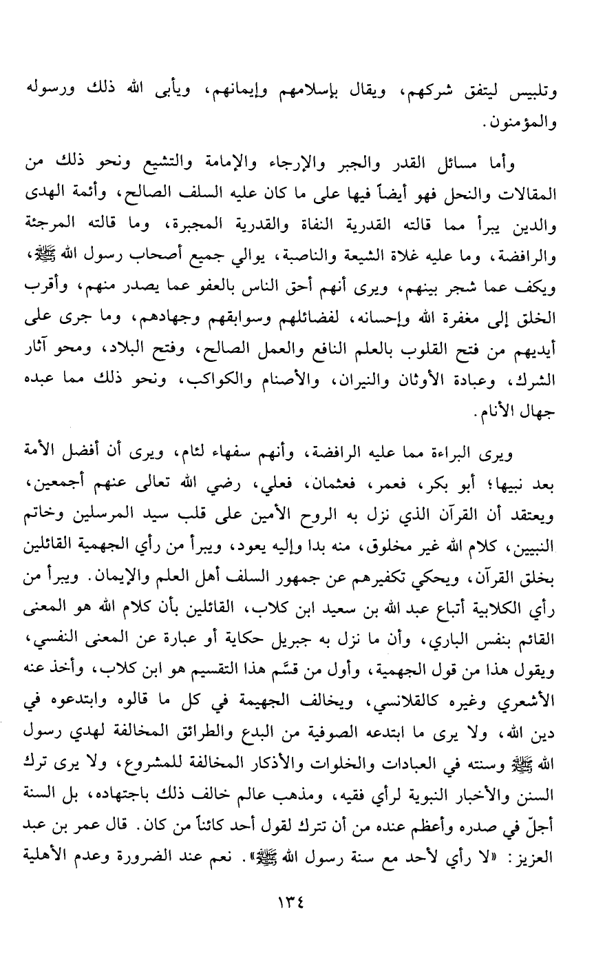 وأما مسائل القدر والجبر والإرجاء والإمامة والتشيع ونحو ذلك من المقالات والنحل فهو أيضاً فيها على ما كان عليه السلف الصالح، وأئمة الهدى والدين يبرأ مما قالته القدرية النفاة والقدرية المجبرة، وما قالته المرجئة والرافضة، وما عليه غلاة الشيعة والناصبة، يوالي جميع أصحاب رسول الله صلى الله عليه وسلم، ويكف عما شجر بينهم، ويرى أنهم أحق الناس بالعفو عما يصدر منهم، وأقرب الخلق إلى مغفرة الله وإحسانه، لفضائلهم وسوابقهم وجهادهم، وما جرى على أيديهم من فتح القلوب بالعلم النافع والعمل الصالح، وفتح البلاد، ومحو آثار الشرك، وعبادة الأوثان والنيران، والأصنام والكواكب، ونحو ذلك مما عبده جهال الأنام.