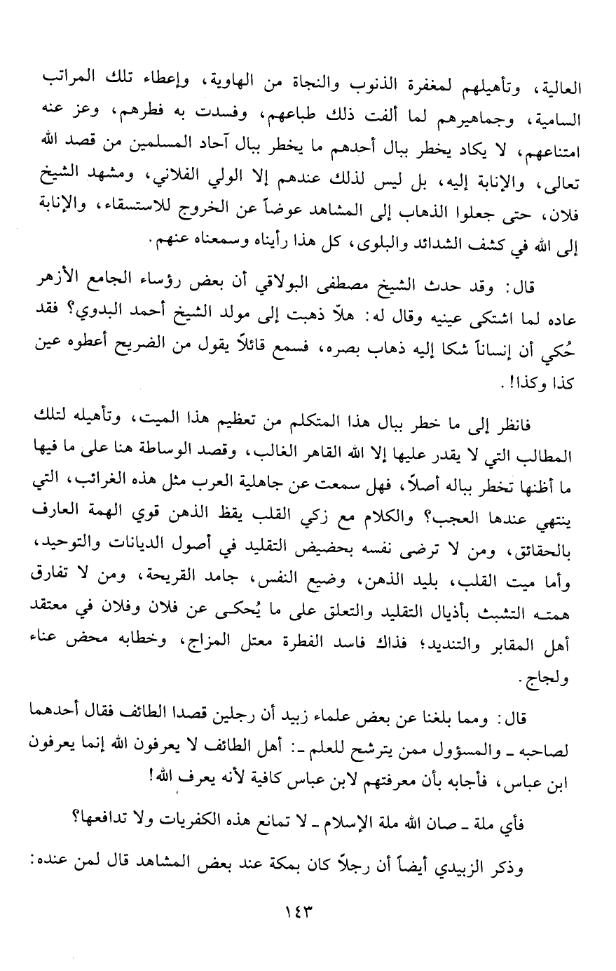 فانظر إلى ما خطر ببال هذا المتكلم من تعظيم هذا الميت، وتأهيله لتلك المطالب التي لا يقدر عليها إلا الله القاهر الغالب، وقصد الوساطة هنا على ما فيها ما أظنها تخطر بباله أصلاً، فهل سمعت عن جاهلية العرب مثل هذه الغرائب، التي ينتهي عندها العجب؟ والكلام مع زكي القلب يقظ الذهن قوي الهمة العارف بالحقائق، ومن لا ترضى نفسه بحضيض التقليد في أصول الديانات والتوحيد، وأما ميت القلب، بليد الذهن، وضيع النفس، جامد القريحة، ومن لا تفارق همته التشبث بأذيال التقليد والتعلق على ما يُحكى عن فلان وفلان في معتقد أهل المقابر والتنديد؛ فذاك فاسد الفطرة معتل المزاج، وخطابه محض عناء ولجاج.