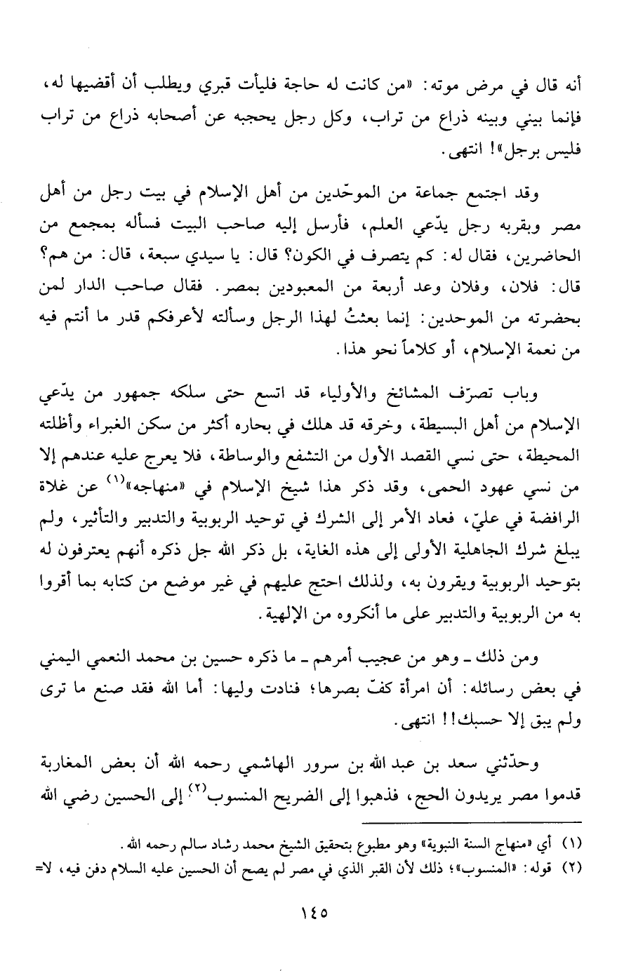 2 قوله: "المنسوب"؛ ذلك لأن القبر الذي في مصر لم يصح أن الحسين عليه السلام دفن فيه، لا هو ولا رأسه الشريفة، وللإمام الطبري كلام في هذا الأمر في "تاريخه"، كذا تكلم على هذا الأمر الخطيب البغدادي وشيخ الإسلام ابن تيمية وغيرهم، والله أعلم.