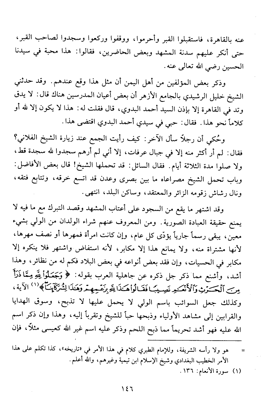 عنه بالقاهرة، فاستقبلوا القبر وأحرموا، ووقفوا وركعوا وسجدوا لصاحب القبر، حتى أنكر عليهم سدنة المشهد وبعض الحاضرين، فقالوا: هذا محبة في سيدنا الحسين رضي الله تعالى عنه.