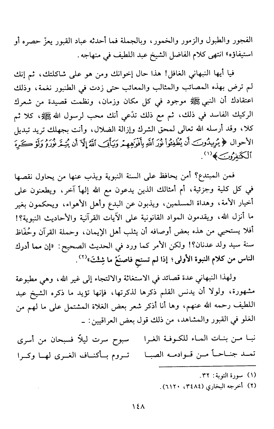 ولهذا النبهاني عدة قصائد في الاستغاثة والالتجاء إلى غير الله، وهي مطبوعة مشهورة، ولولا أن يدنس القلم ذكرها لذكرتها، فإنها تؤيد ما ذكره الشيخ عبد اللطيف رحمه الله عنهم، وها أنا أذكر شعر بعض الغلاة المشتمل على ما لهم من الغلو في القبور والمشاهد، من ذلك قول بعض العراقيين:-