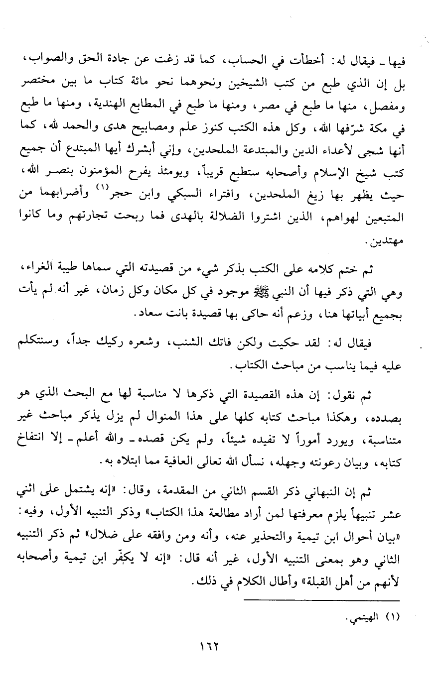 فيها- فيقال له: أخطأت في الحساب، كما قد زغت عن جادة الحق والصواب، بل إن الذي طبع من كتب الشيخين ونحوهما نحو مائة كتاب ما بين مختصر ومفصل، منها ما طبع في مصر، ومنها ما طبع في المطابع الهندية، ومنها ما طبع في مكة شرّفها الله، وكل هذه الكتب كنوز علم ومصابيح هدى والحمد لله، كما أنها شجى لأعداء الدين والمبتدعة الملحدين، وإني أبشرك أيها المبتدع أن جميع كتب شيخ الإسلام وأصحابه ستطبع قريباً، ويومئذ يفرح المؤمنون بنصر الله، حيث يظهر بها زيغ الملحدين، وافتراء السبكي وابن حجر1 وأضرابهما من المتبعين لهواهم، الذين اشتروا الضلالة بالهدى فما ربحت تجارتهم وما كانوا مهتدين.