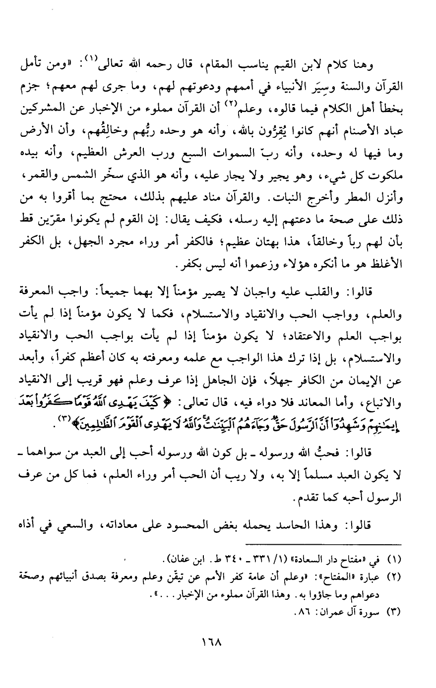 2 عبارة "المفتاح": "وعلم أن عامة كفر الأمم عن تيقّن وعلم ومعرفة بصدق أنبيائهم وصحّة دعواهم وما جاؤوا به. وهذا القرآن مملوء من الإخبار ... ".