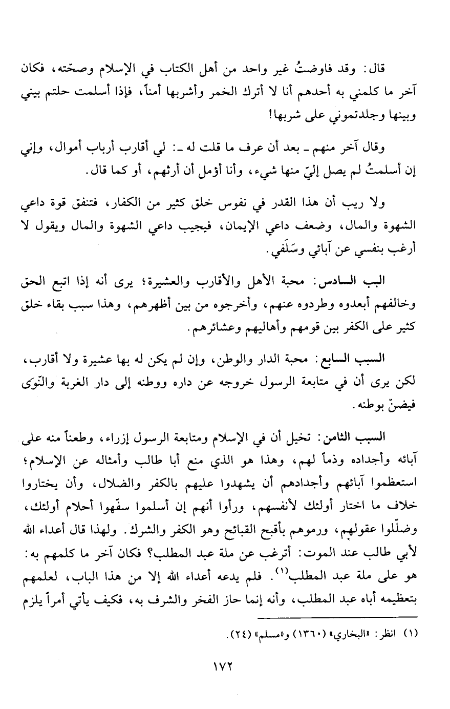 قال: وقد فاوضتُ غير واحد من أهل الكتاب في الإسلام وصحّته، فكان آخر ما كلمني به أحدهم أنا لا أترك الخمر وأشربها أمناً، فإذا أسلمت حلتم بيني وبينها وجلدتموني على شربها!