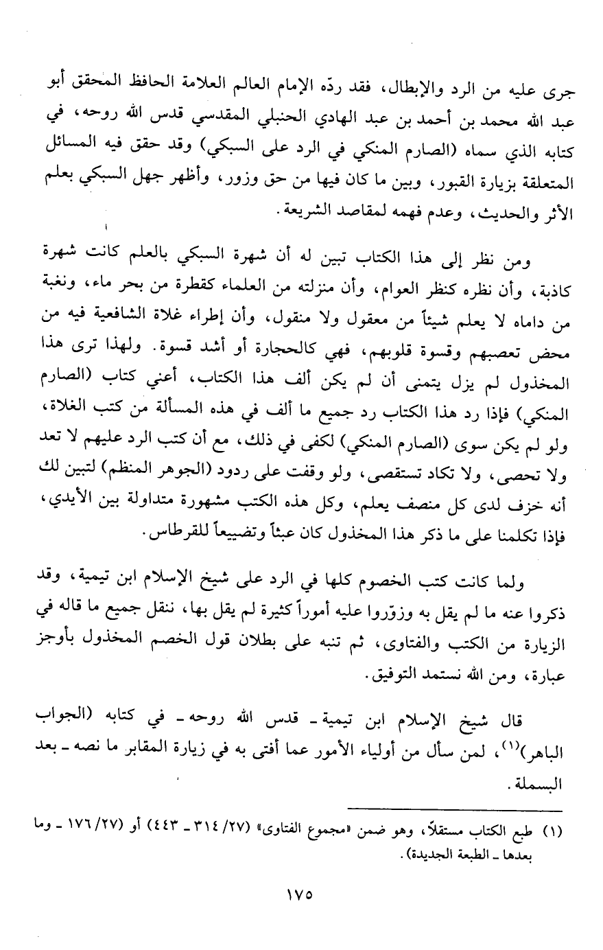 ولما كانت كتب الخصوم كلها في الرد على شيخ الإسلام ابن تيمية، وقد ذكروا عنه ما لم يقل به وزوّروا عليه أموراً كثيرة لم يقل بها، ننقل جميع ما قاله في الزيارة من الكتب والفتاوى، ثم تنبه على بطلان قول الخصم المخذول بأوجز عبارة، ومن الله نستمد التوفيق.