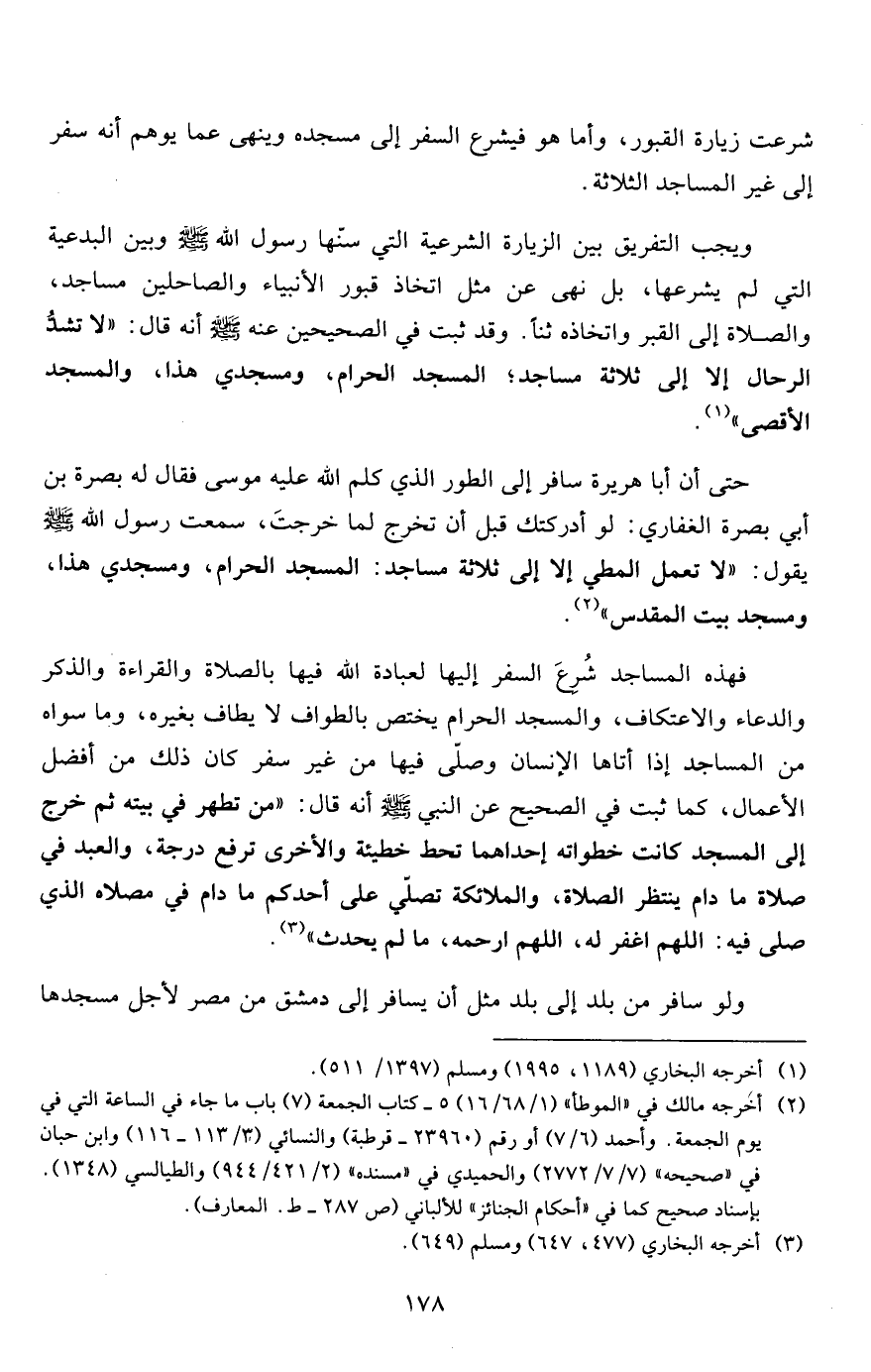 فهذه المساجد شُرِعَ السفر إليها لعبادة الله فيها بالصلاة والقراءة والذكر والدعاء والاعتكاف، والمسجد الحرام يختص بالطواف لا يطاف بغيره، وما سواه من المساجد إذا أتاها الإنسان وصلّى فيها من غير سفر كان ذلك من أفضل الأعمال، كما ثبت في الصحيح عن النبي صلى الله عليه وسلم أنه قال: "من تطهر في بيته ثم خرج إلى المسجد كانت خطواته إحداهما تحط خطيئة والأخرى ترفع درجة، والعبد في صلاة ما دام ينتظر الصلاة، والملائكة تصلي على أحدكم ما دام في مصلاه الذي صلى فيه: اللهم اغفر له، اللهم ارحمه، ما لم يحدث"3.