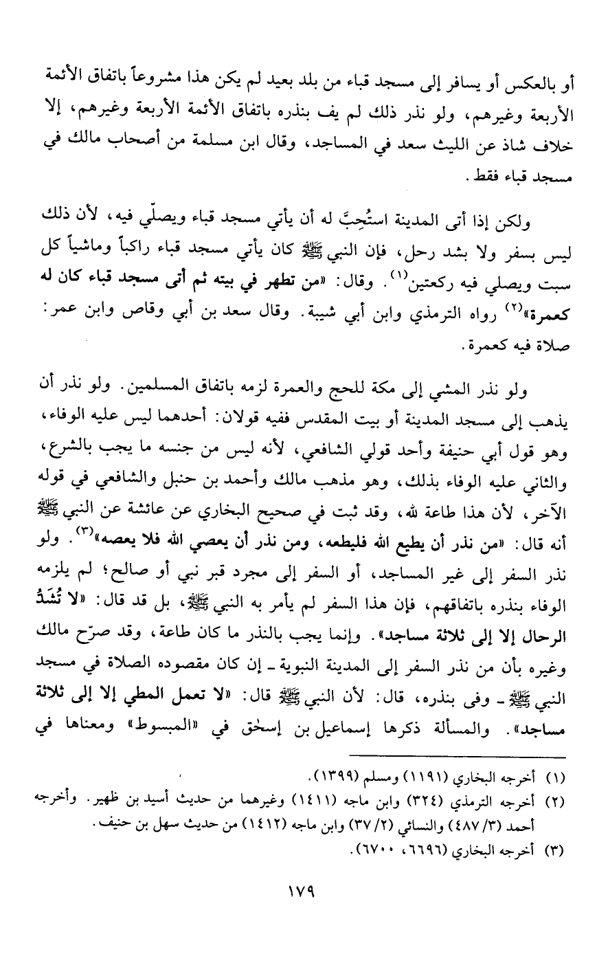 ولو نذر المشي إلى مكة للحج والعمرة لزمه باتفاق المسلمين. ولو نذر أن يذهب إلى مسجد المدينة أو بيت المقدس ففيه قولان: أحدهما ليس عليه الوفاء، وهو قول أبي حنيفة وأحد قولي الشافعي، لأنه ليس من جنسه ما يجب بالشرع، والثاني عليه الوفاء بذلك، وهو مذهب مالك وأحمد بن حنبل والشافعي في قوله الآخر، لأن هذا طاعة لله، وقد ثبت في صحيح البخاري عن عائشة عن النبي صلى الله عليه وسلم أنه قال: "من نذر أن يطيع الله فليطعه، ومن نذر أن يعصي الله فلا يعصه"3. ولو نذر السفر إلى غير المساجد، أو السفر إلى مجرد قبر نبي أو صالح؛ لم يلزمه الوفاء بنذره باتفاقهم، فإن هذا السفر لم يأمر به النبي صلى الله عليه وسلم، بل قد قال: "لا تُشَدُّ الرحال إلا إلى ثلاثة مساجد". وإنما يجب بالنذر ما كان طاعة، وقد صرح مالك وغيره بأن من نذر السفر إلى المدينة النبوية -إن كان مقصوده الصلاة في مسجد النبي صلى الله عليه وسلم- وفى بنذره، قال: لأن النبي صلى الله عليه وسلم قال: "لا تعمل المطي إلا إلى ثلاثة مساجد". والمسألة ذكرها إسماعيل بن إسحق في "المبسوط"ومعناها في
